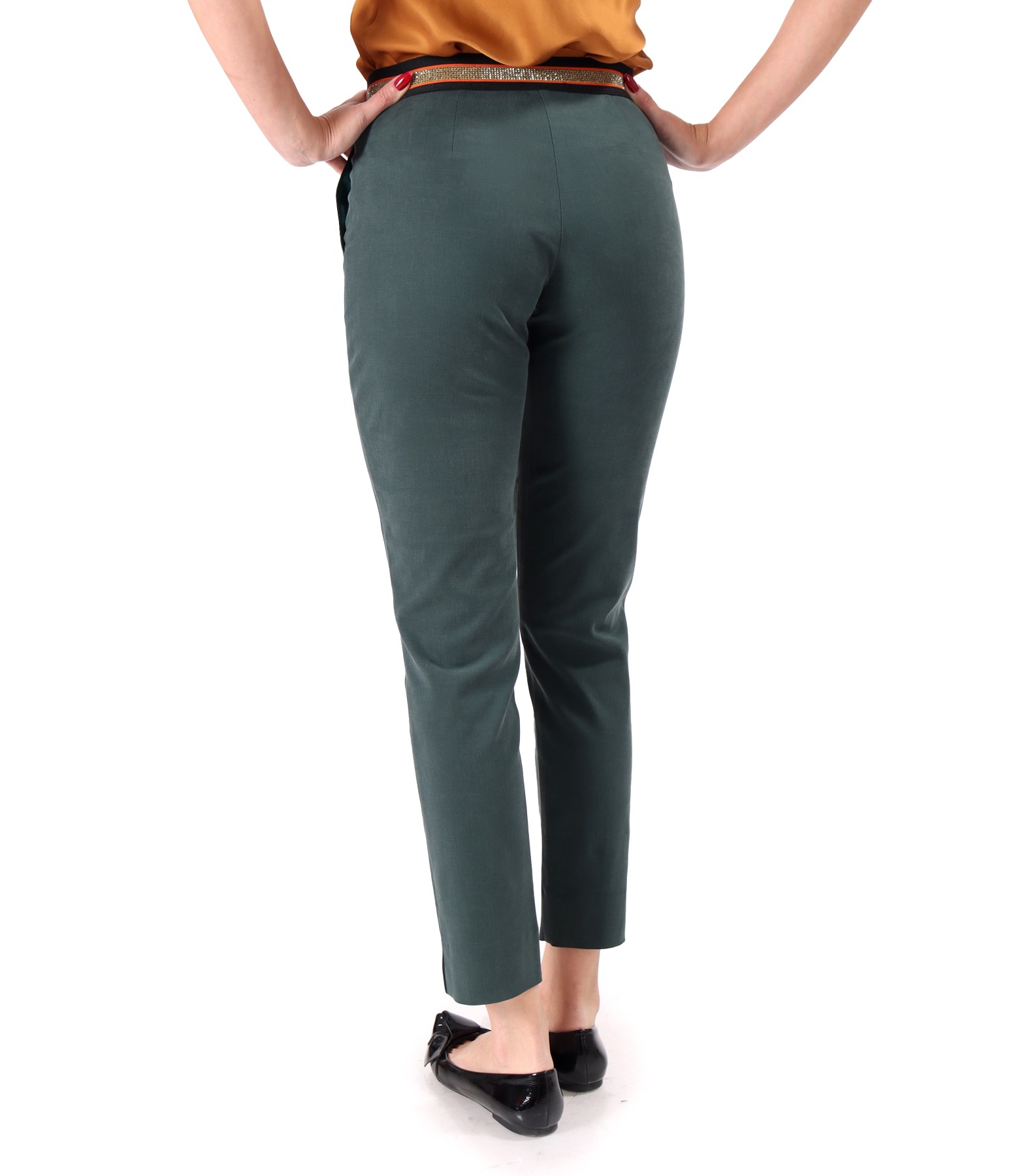 Pantaloni pana din stofa plina din tencel cu bumbac, cu buzunare pe fata si cu banda elastica decorativa cu cristale in talie. Se inchid cu fermoar normal, contra-nasture si 2 capse mos-baba pe fata.