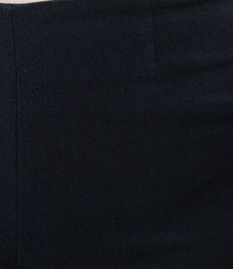 Pantaloni lejeri din stofa elastica, forma pana, calcati la dunga. Se inchid cu fermoar ascuns pe lateral stanga.