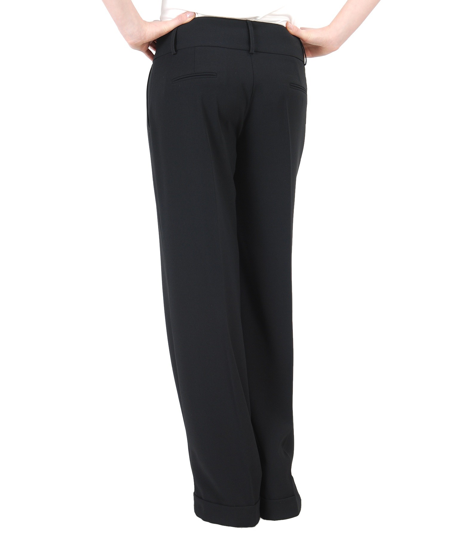Pantaloni evazati, lejeri, calcati la dunga, cu mansete la terminatie, buzunare laterale si cordon lat in talie cu gaici. Se inchid pe fata cu contra-nasture, 2 capse mos-baba si fermoar normal.