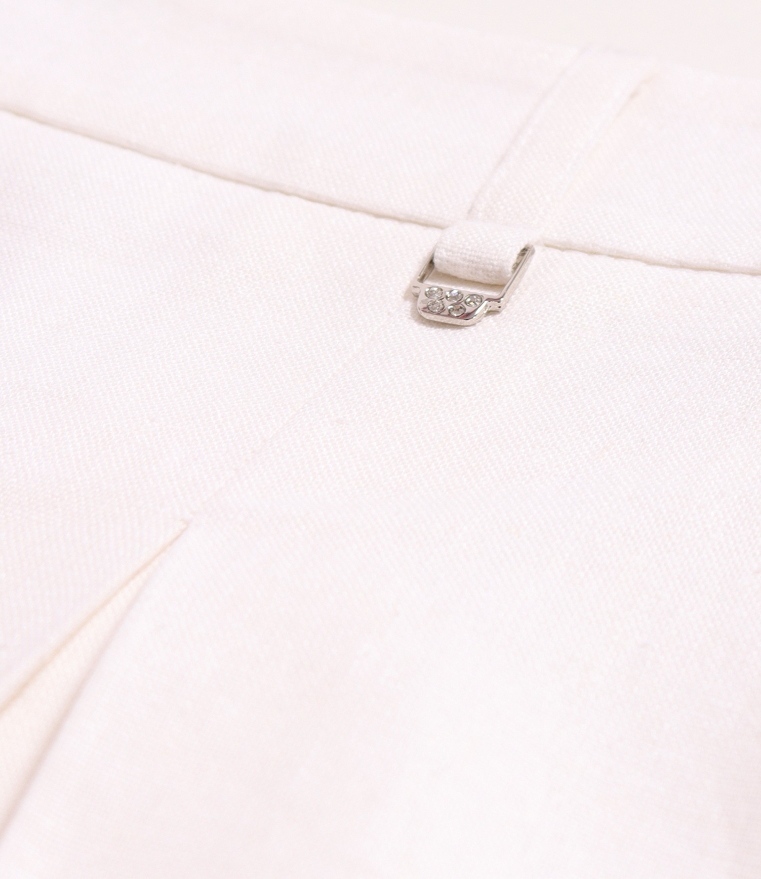 Pantaloni largi cu in, cu talie inalta, cu cordon lat in talie, falduri pe fata si buzunare oblice laterale. Se inchid cu fermoar normal, contra-nasture si 2 capse mos-baba pe fata.