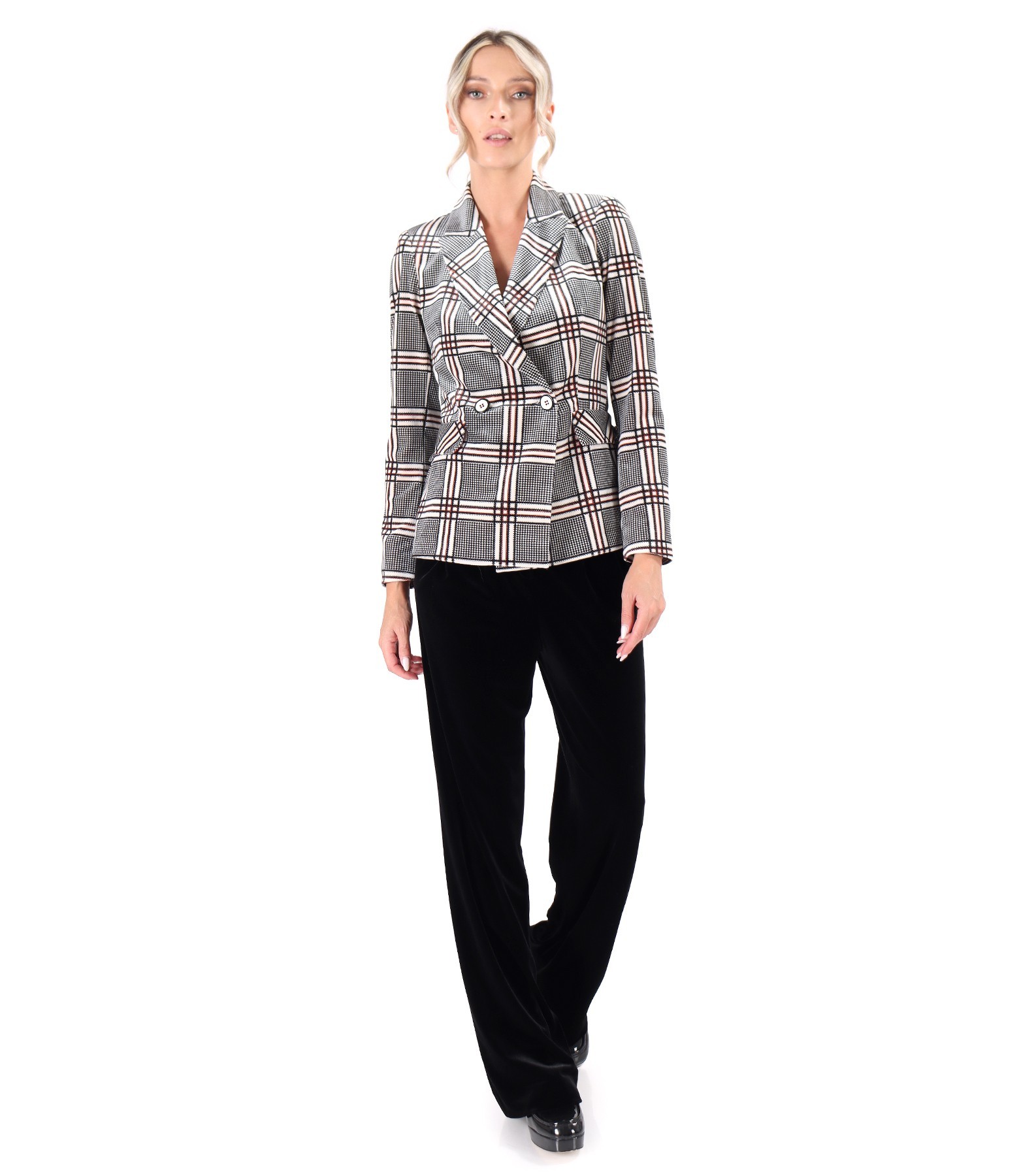 Pantaloni largi din catifea elastica neagra, cu talie inalta, cu cordon lat in talie, falduri pe fata si buzunare oblice laterale. Se inchid cu fermoar normal, contra-nasture si 2 capse mos-baba pe fata.