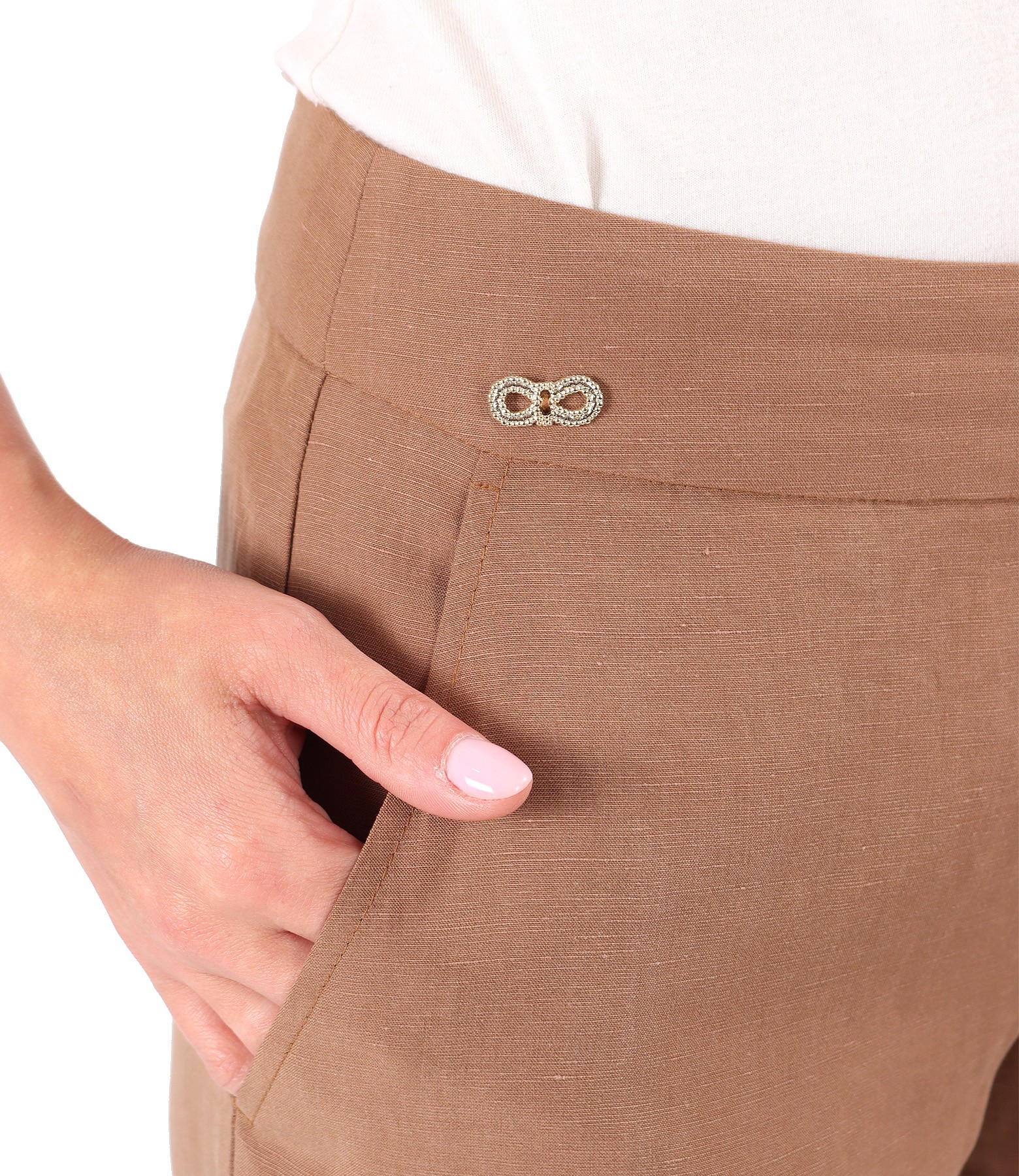 Pantaloni lejeri din tencel cu in, cu buzunare laterale si cordon lat in talie. Se inchide cu fermoar ascuns pe lateral stanga.