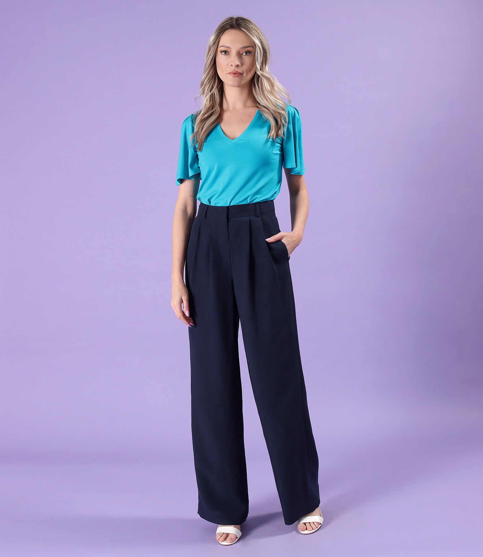 Pantaloni lejeri din tencel cu in, cu talie inalta cu pliuri pe fata si buzunare laterale. Se inchid cu fermoar normal si 2 capse mos-baba pe fata.