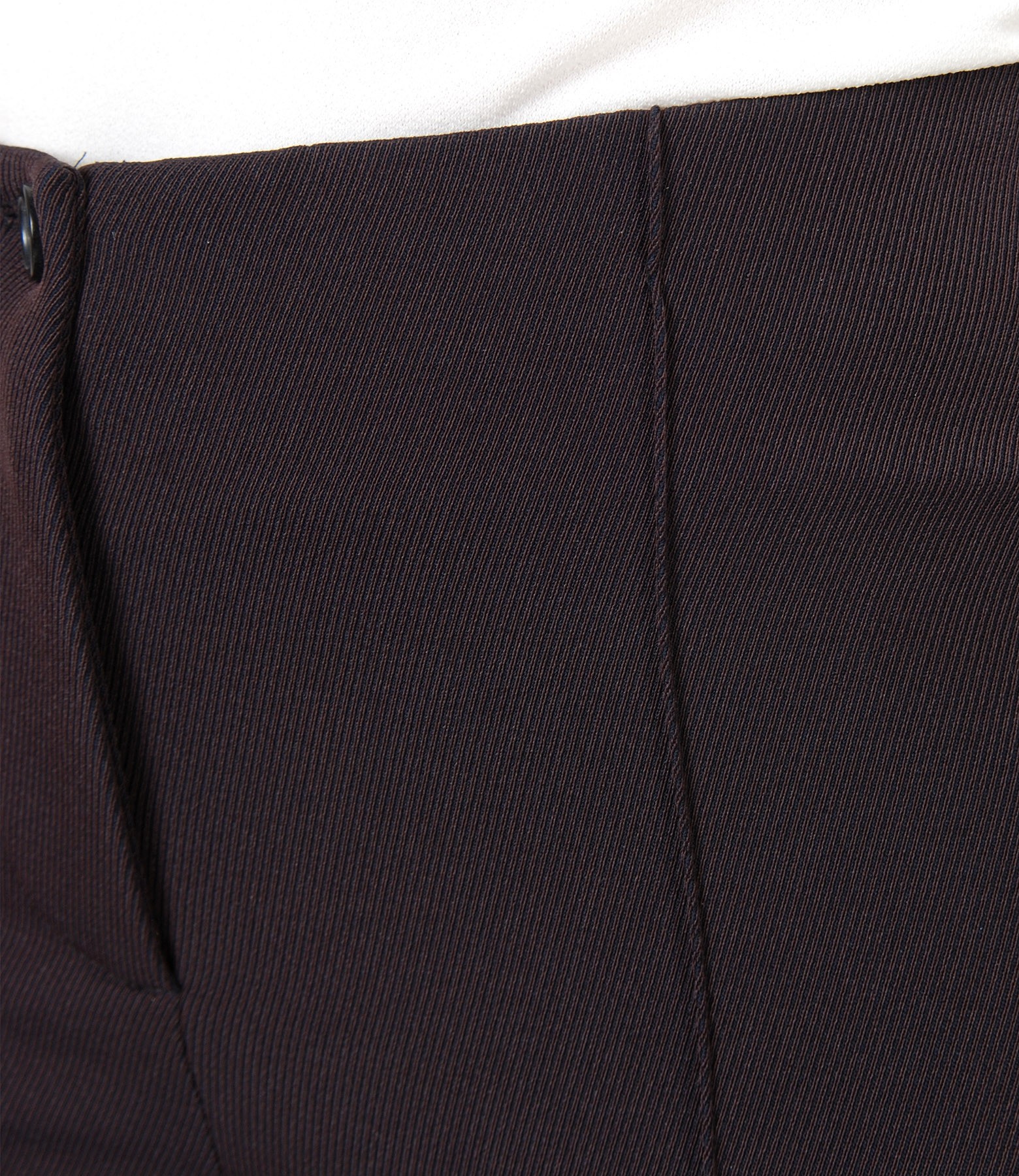 Pantaloni office din stofa elastica texturata, cu un usor efect sidefat, cu elastic in talie si dunga cusuta. Se inchid cu fermoar si nasture pe fata.