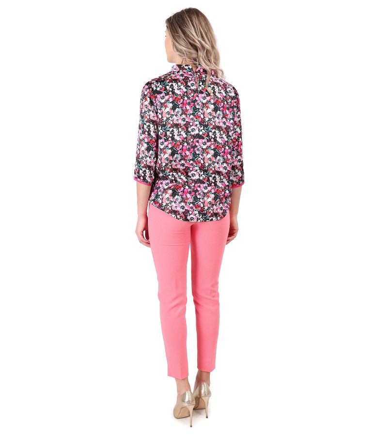 Bluza eleganta, usor satinata, imprimata cu motive florale, maneci 3/4 cu elastic la terminatie, cu fald pe mijloc fata si decolteu rotund.