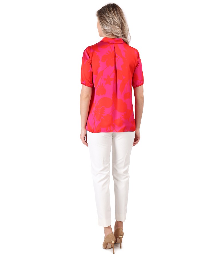 Bluza eleganta, usor satinata, imprimata cu motive florale, maneci scurte cu elastic la terminatie, cu fald pe mijloc spate si decolteu rotund cu V inchis pe fata cu un nasture.