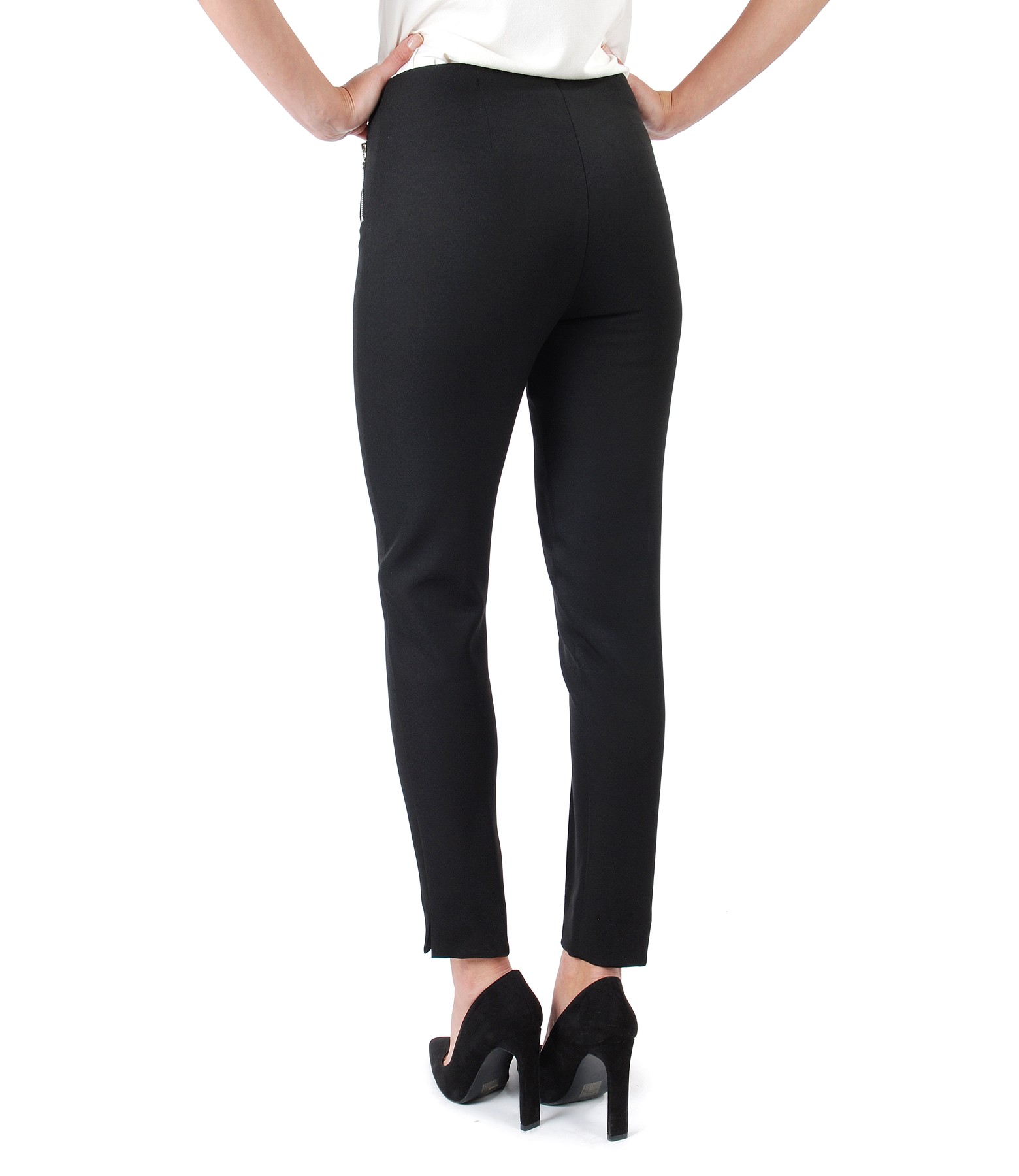 Pantaloni pana din stofa elastica, cu fermoare decorative, cu elastic in talie si dunga cusuta pe fata. Se inchid cu fermoar si nasture pe fata.