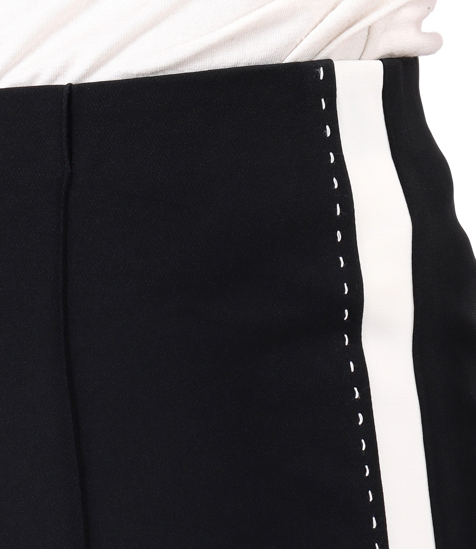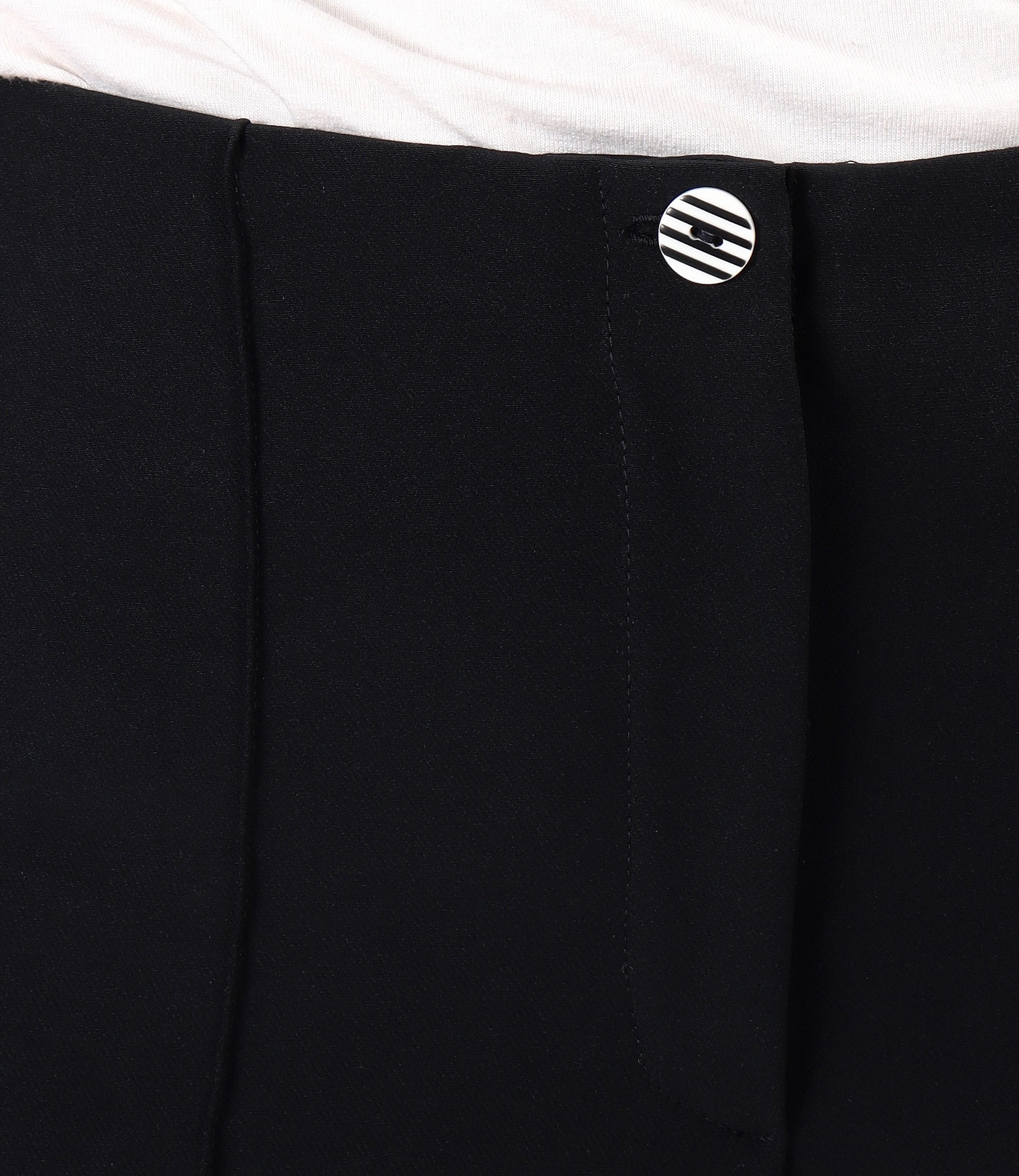 Pantaloni pana din stofa elastica, cu elastic in talie si vipusca alba cu cusatura in contrast pe laterale. Se inchid cu fermoar si nasture pe fata.