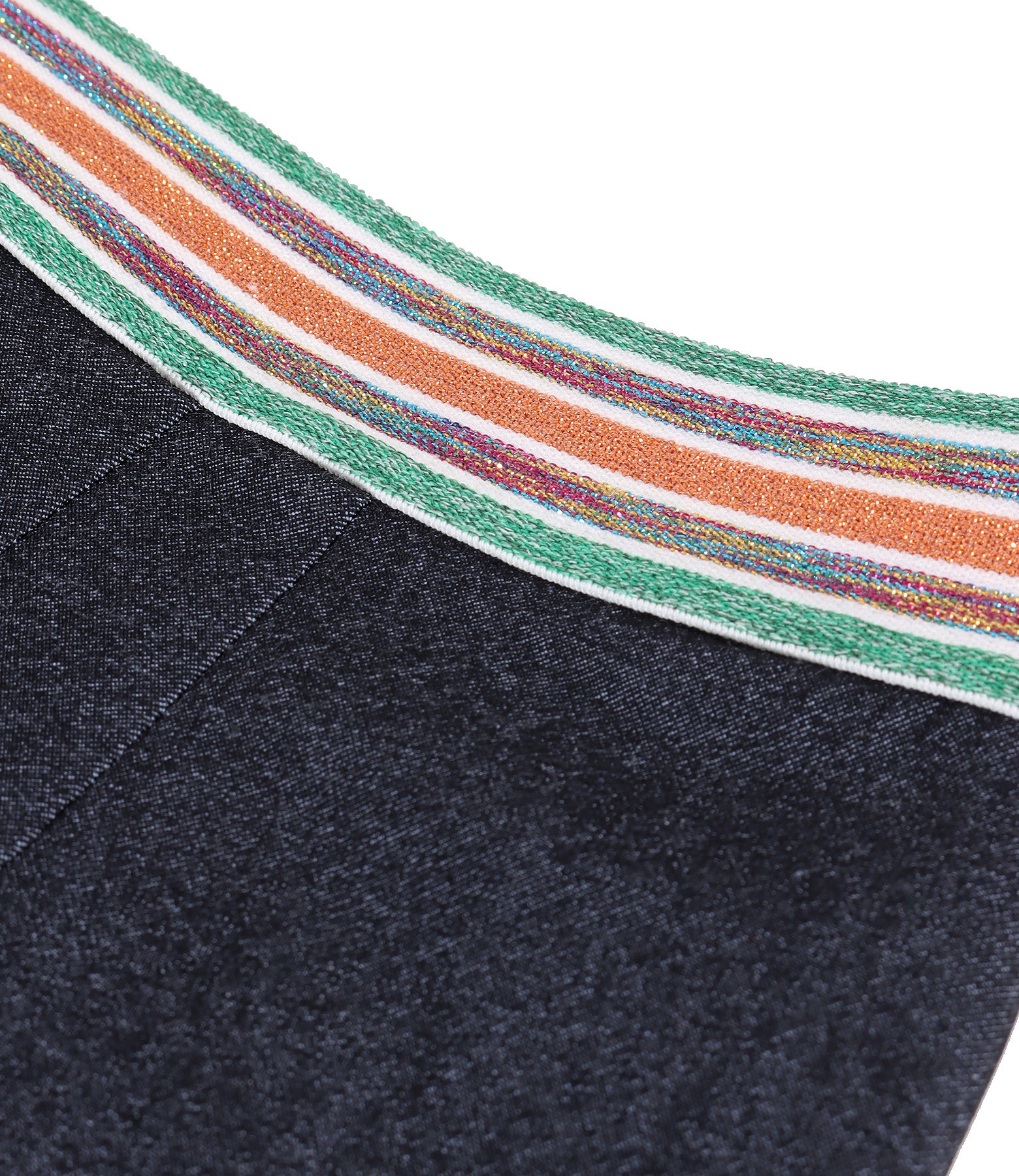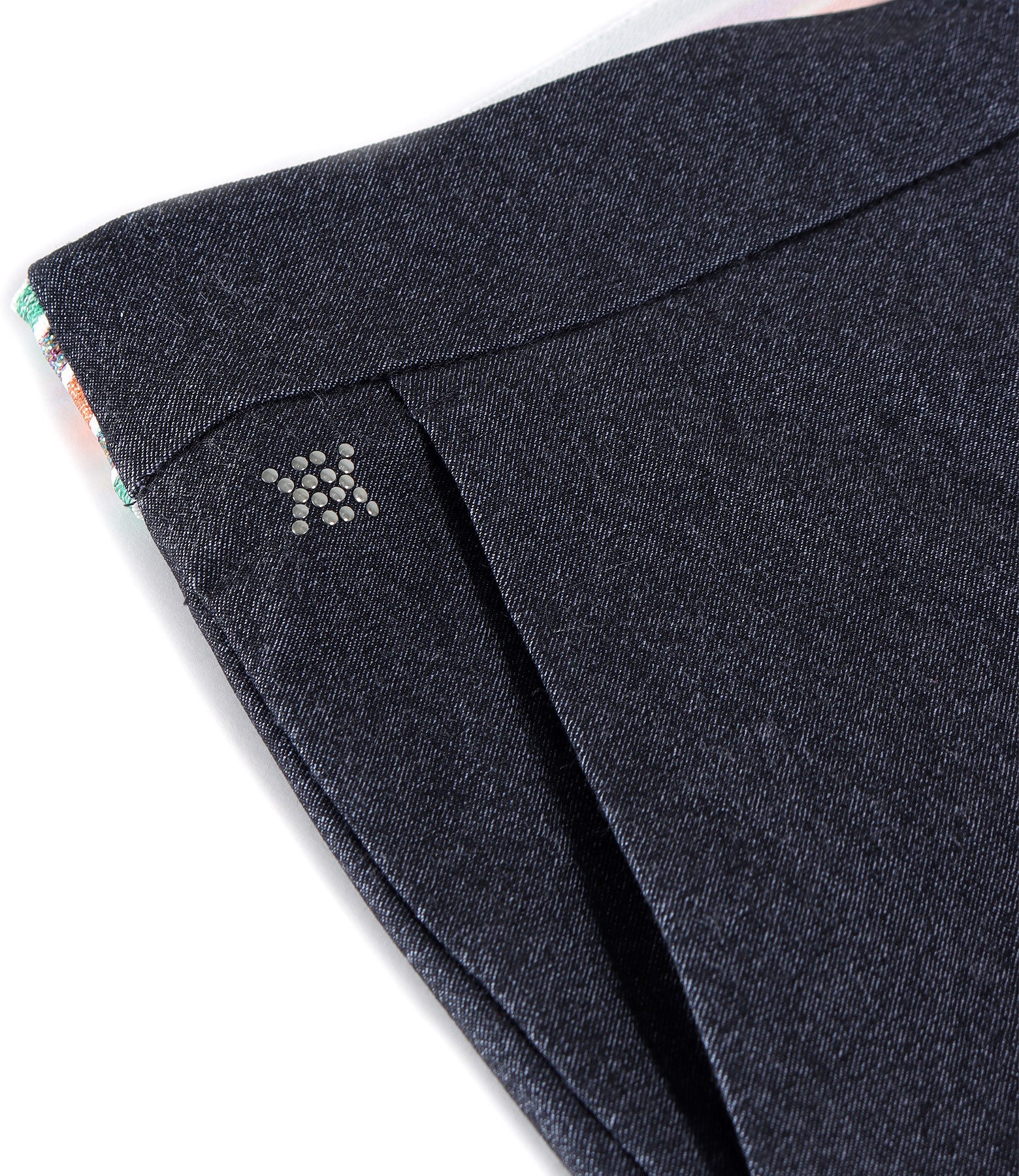 Pantaloni pana din denim elastic, cu cordon in talie fata si elastic multicolor pe spate si buzunare oblice laterale. Se inchid cu fermoar normal, contra-nasture si 2 capse mos-baba pe fata.