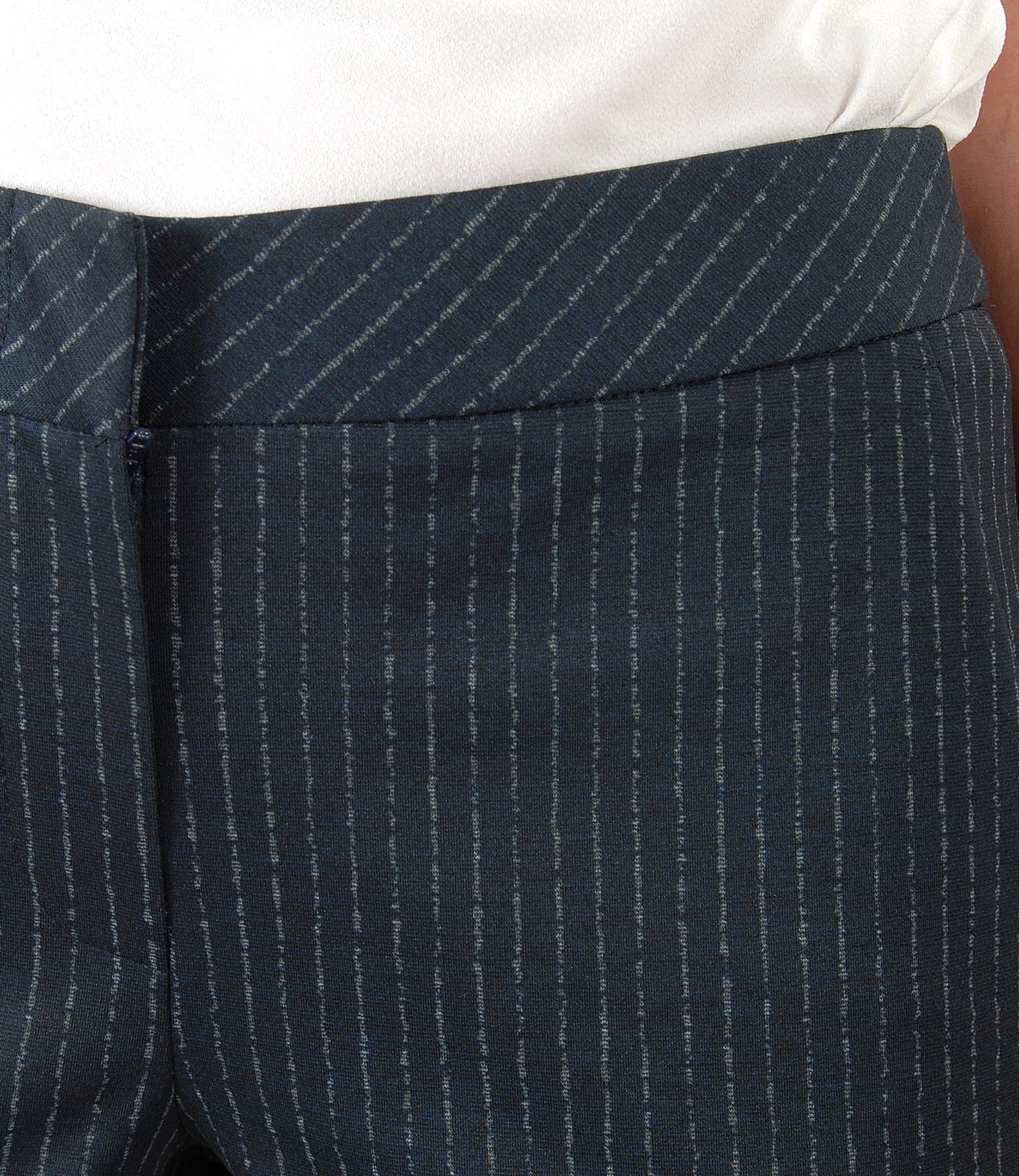 Pantaloni pana din jerse elastic gros cu dungi verticale fine, cu cordon in talie fata si elastic pe spate si buzunare oblice laterale. Se inchid cu fermoar normal, contra-nasture si 2 capse mos-baba pe fata.