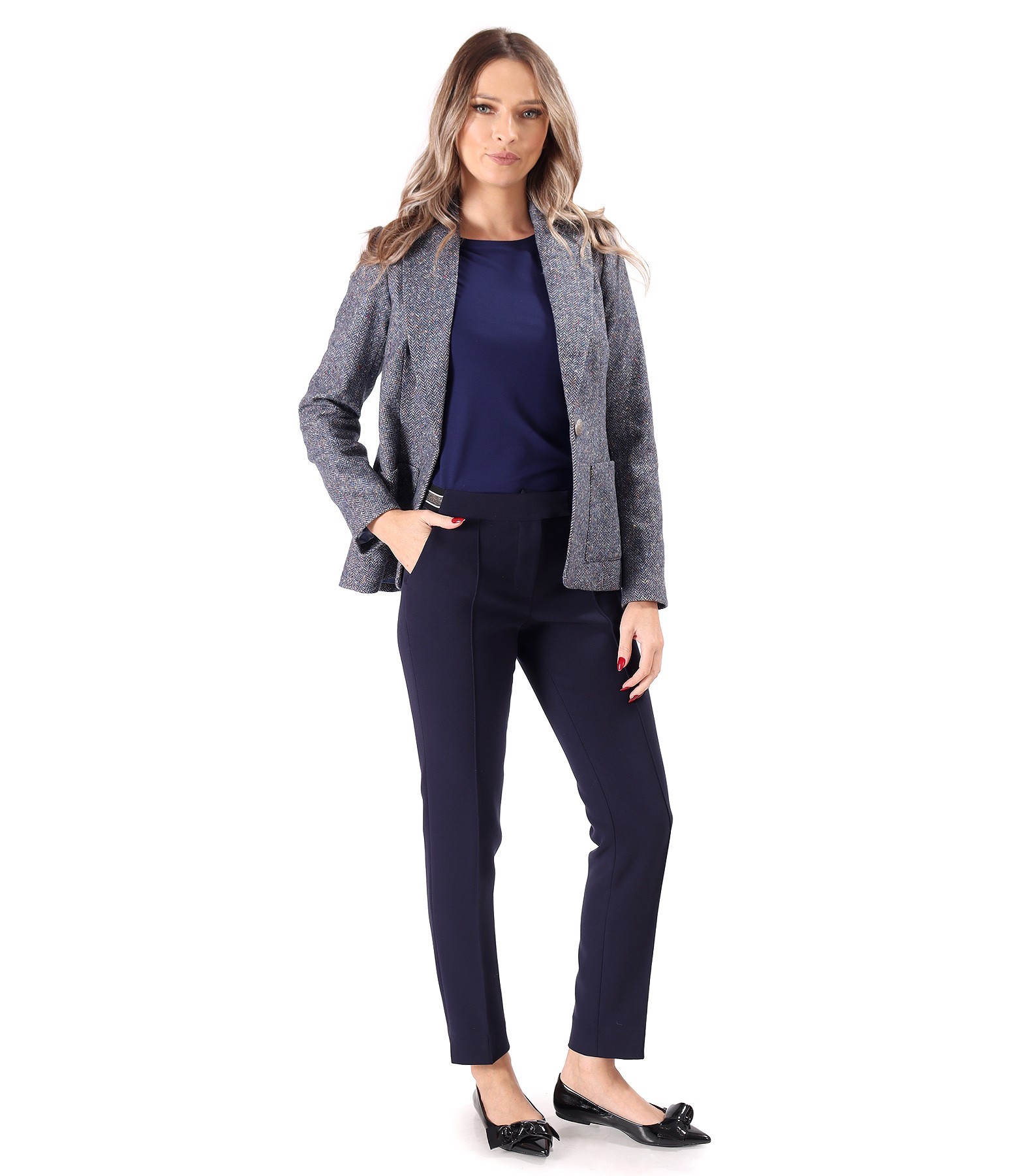 Pantaloni pana lejeri din stofa elastica cu viscoza, cu dunga cusuta pe fata, buzunare laterale si banda elastica decorativa cu cristale in talie. Se inchid cu fermoar normal, contra-nasture si 2 capse mos-baba pe fata.