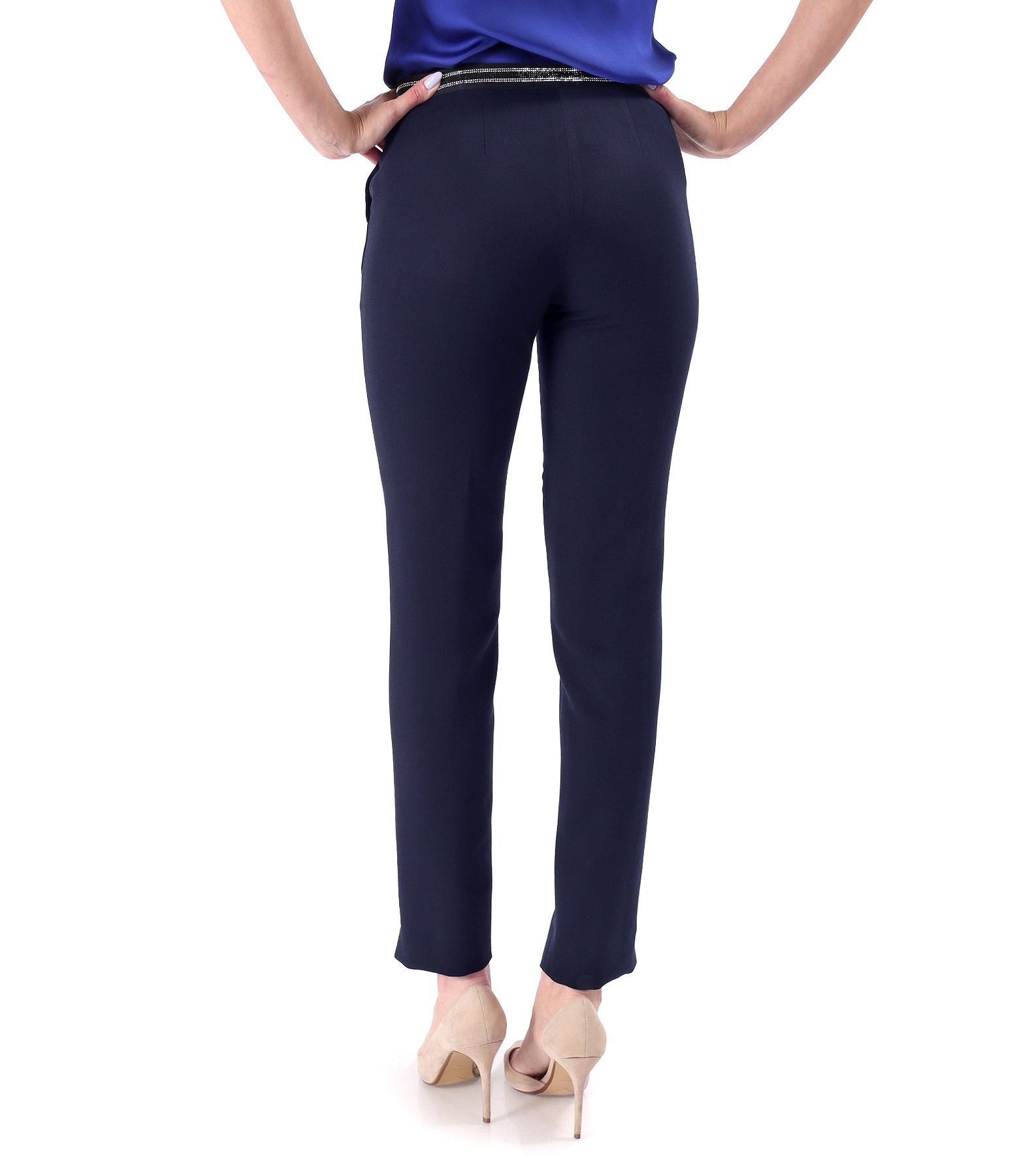 Pantaloni pana lejeri din stofa elastica cu viscoza, cu dunga cusuta pe fata, buzunare laterale si banda elastica decorativa cu cristale in talie. Se inchid cu fermoar normal, contra-nasture si 2 capse mos-baba pe fata.