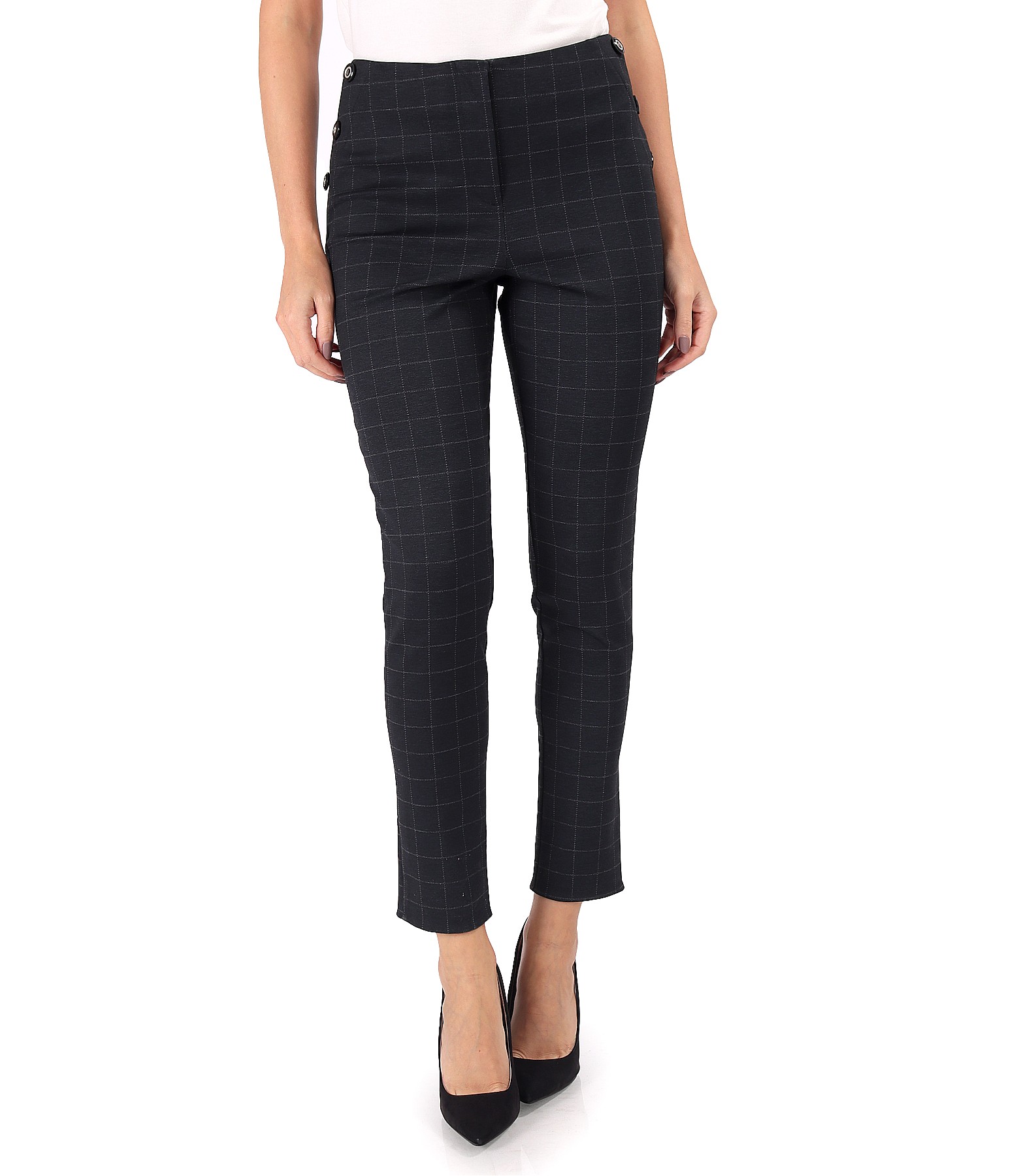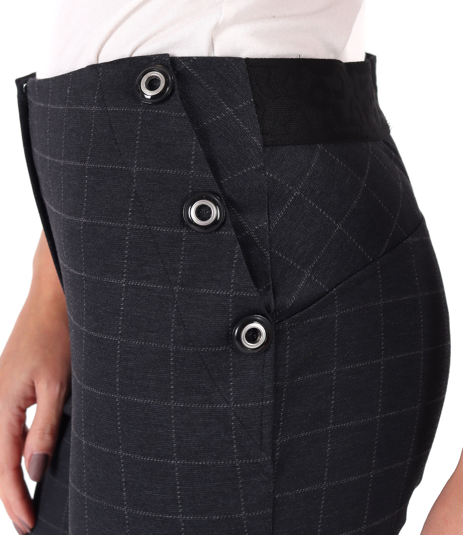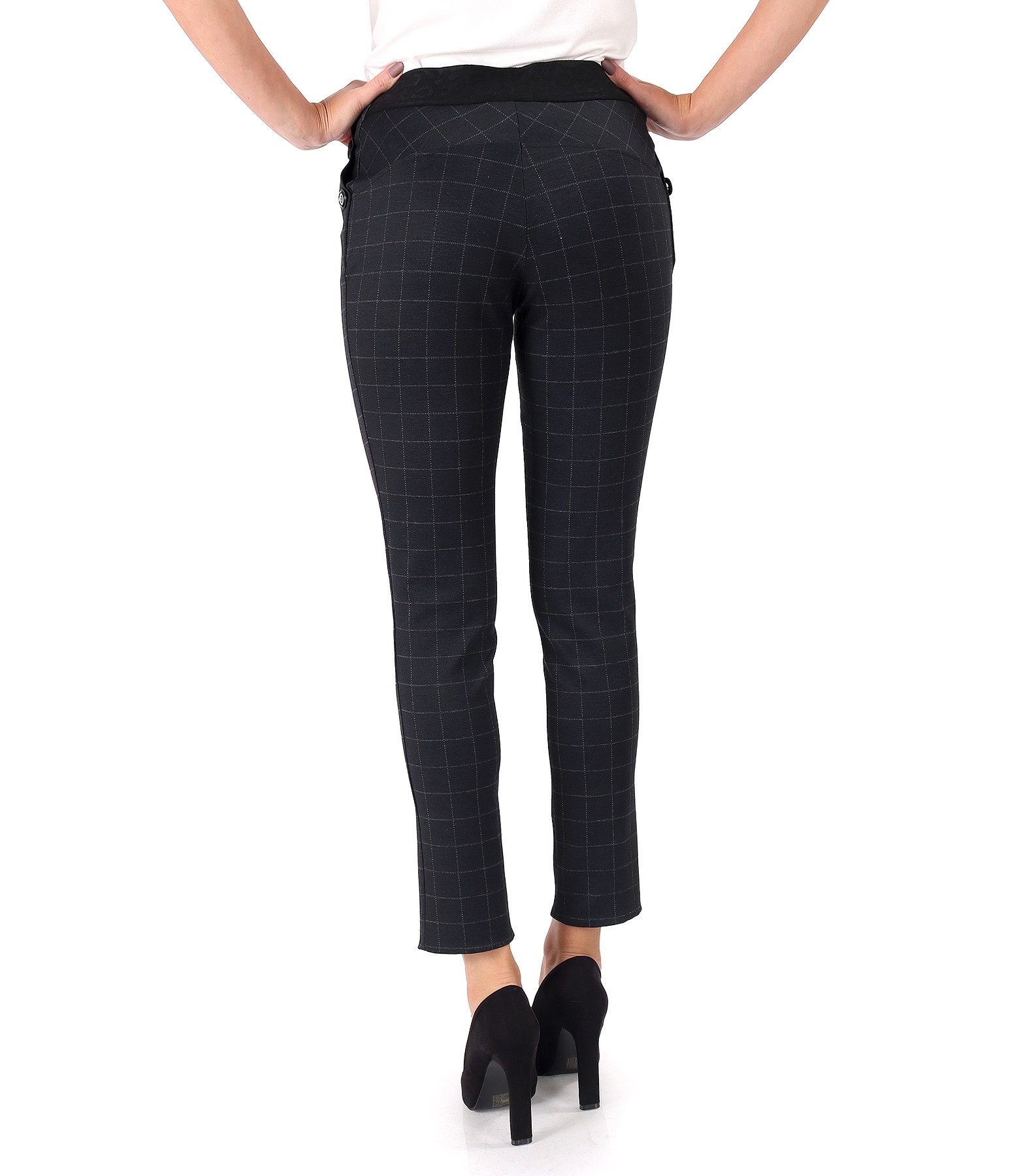 Pantaloni pana din stofa groasa in carouri, cu buzunare laterale false, cu 3 nasturi si cu elastic in talie spate. Se inchid cu fermoar si capse mos-baba pe fata.