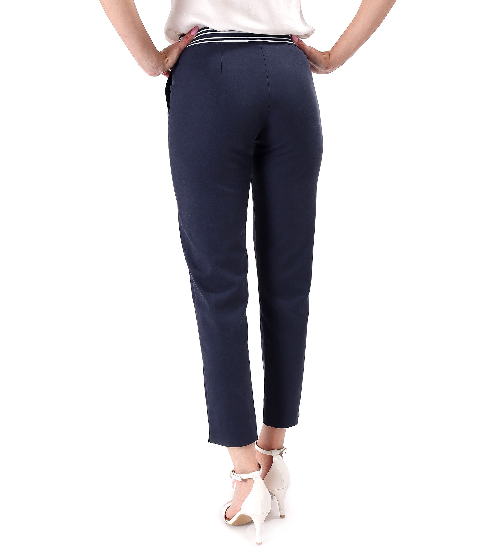 Pantaloni pana lejeri, din tencel cu bumbac, cu buzunare pe fata si cu banda elastica multicolora in talie. Se inchid cu fermoar normal, contra-nasture si 2 capse mos-baba pe fata.