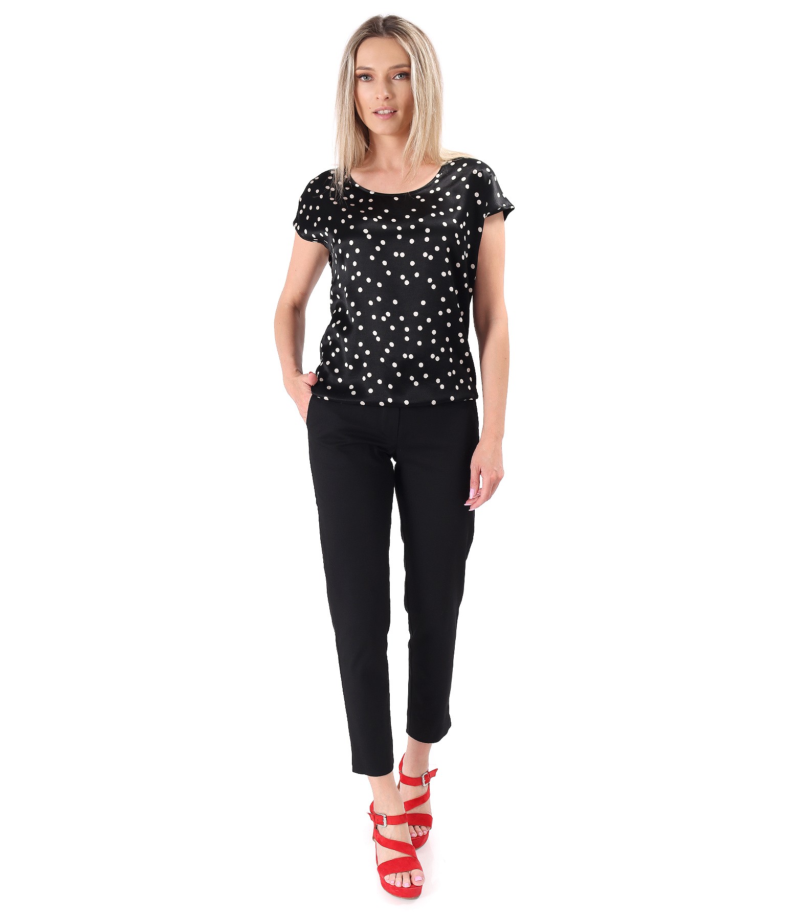 Pantaloni pana lejeri, din tencel cu bumbac, cu buzunare pe fata si cu banda elastica multicolora in talie. Se inchid cu fermoar normal, contra-nasture si 2 capse mos-baba pe fata.