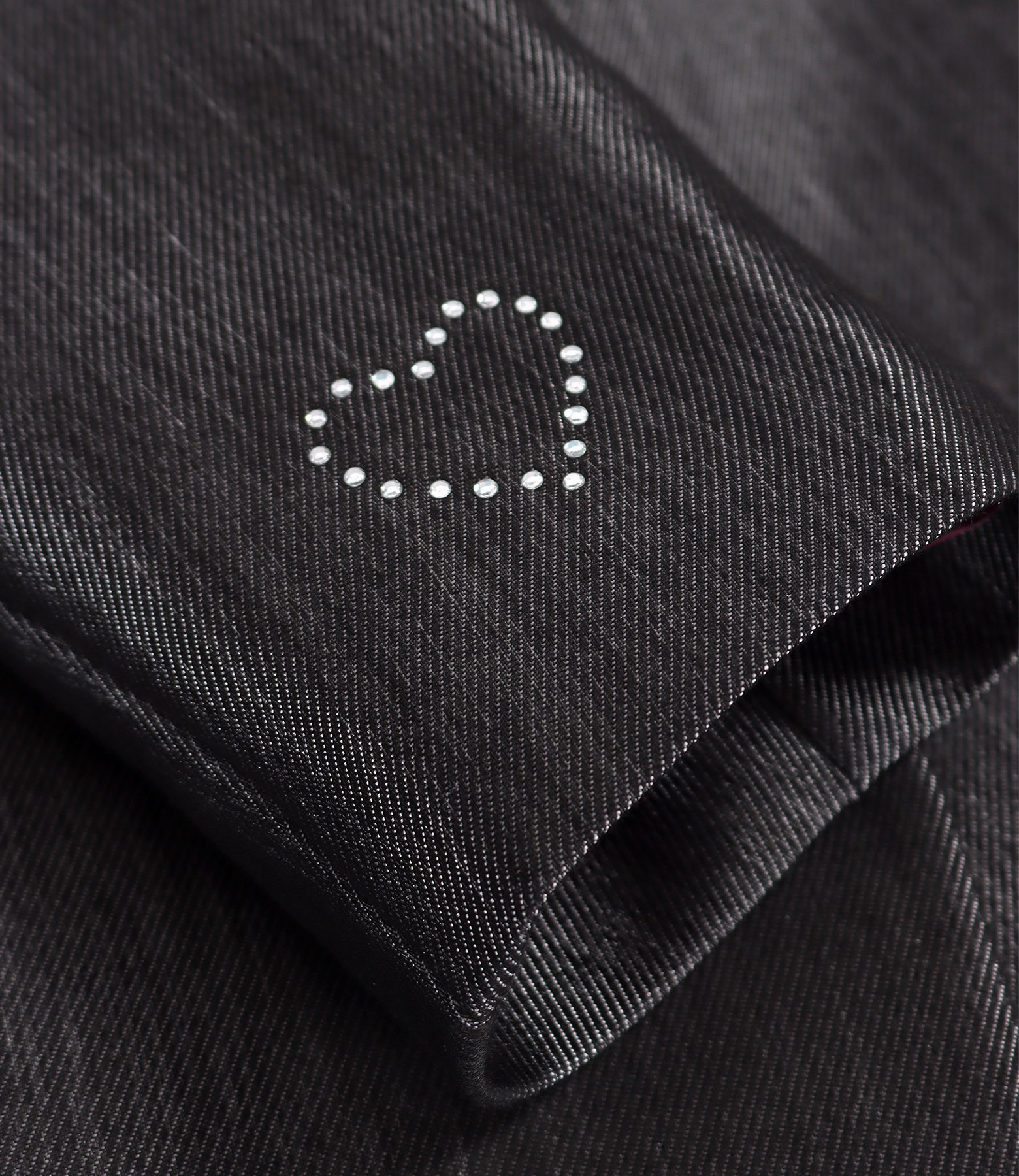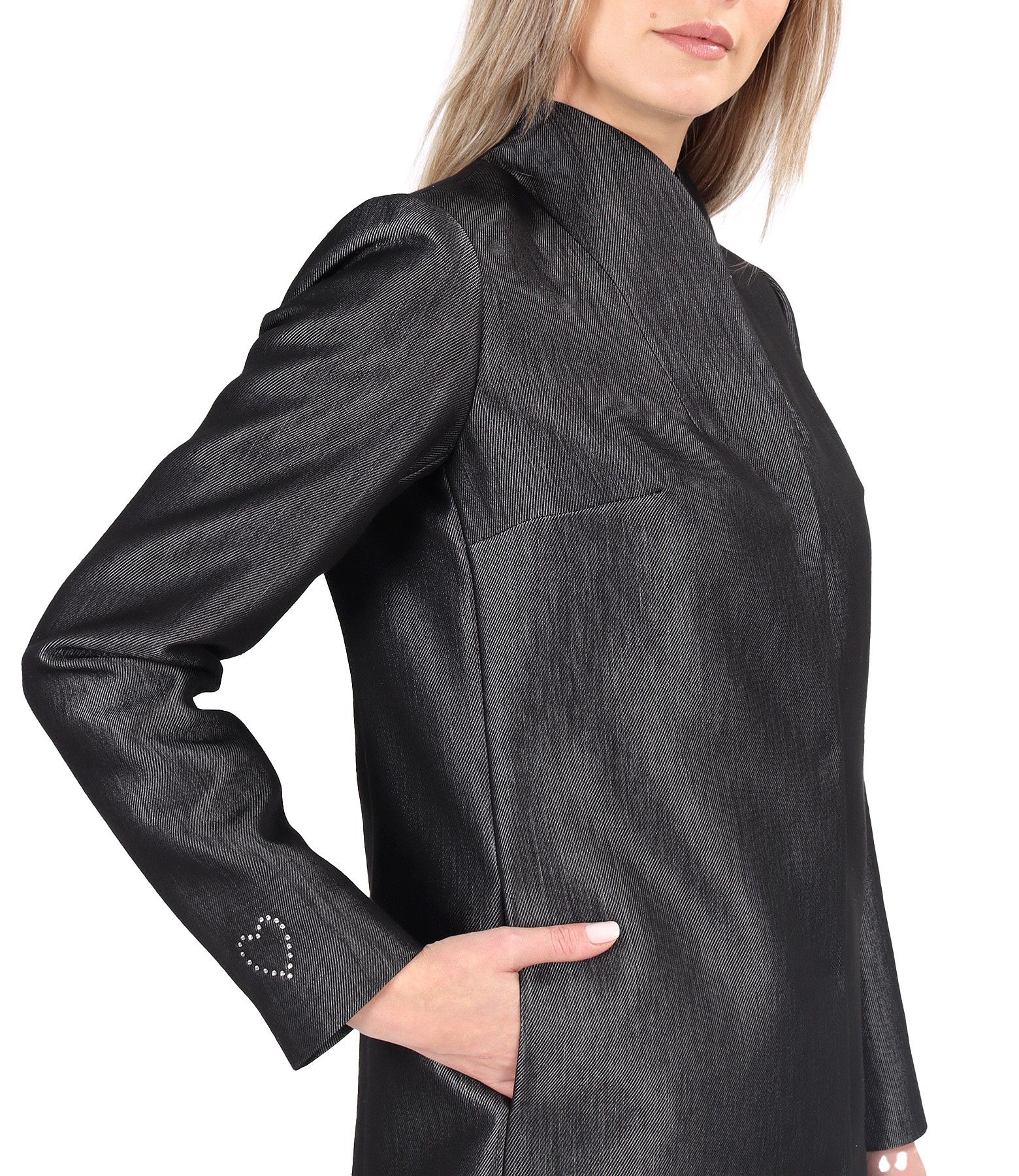 Pardesiu elegant din stofa cu efect lucios, captusita cu acetat in contrast. Are aplicatie de cristale in forma de inima pe maneca, guler gen tunica, buzunare laterale si slit pe spate. Se inchide pe fata cu 4 capse metalice.