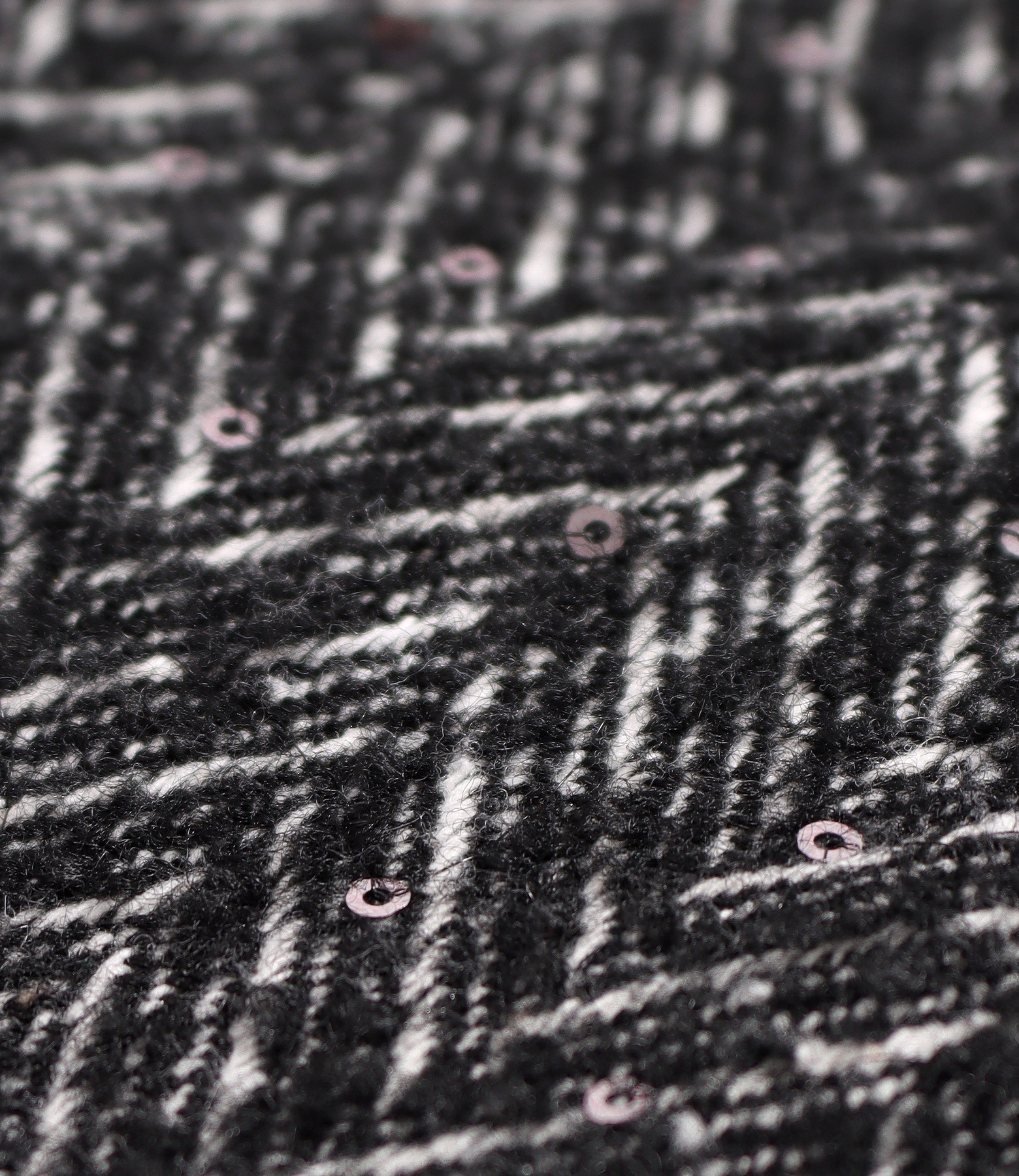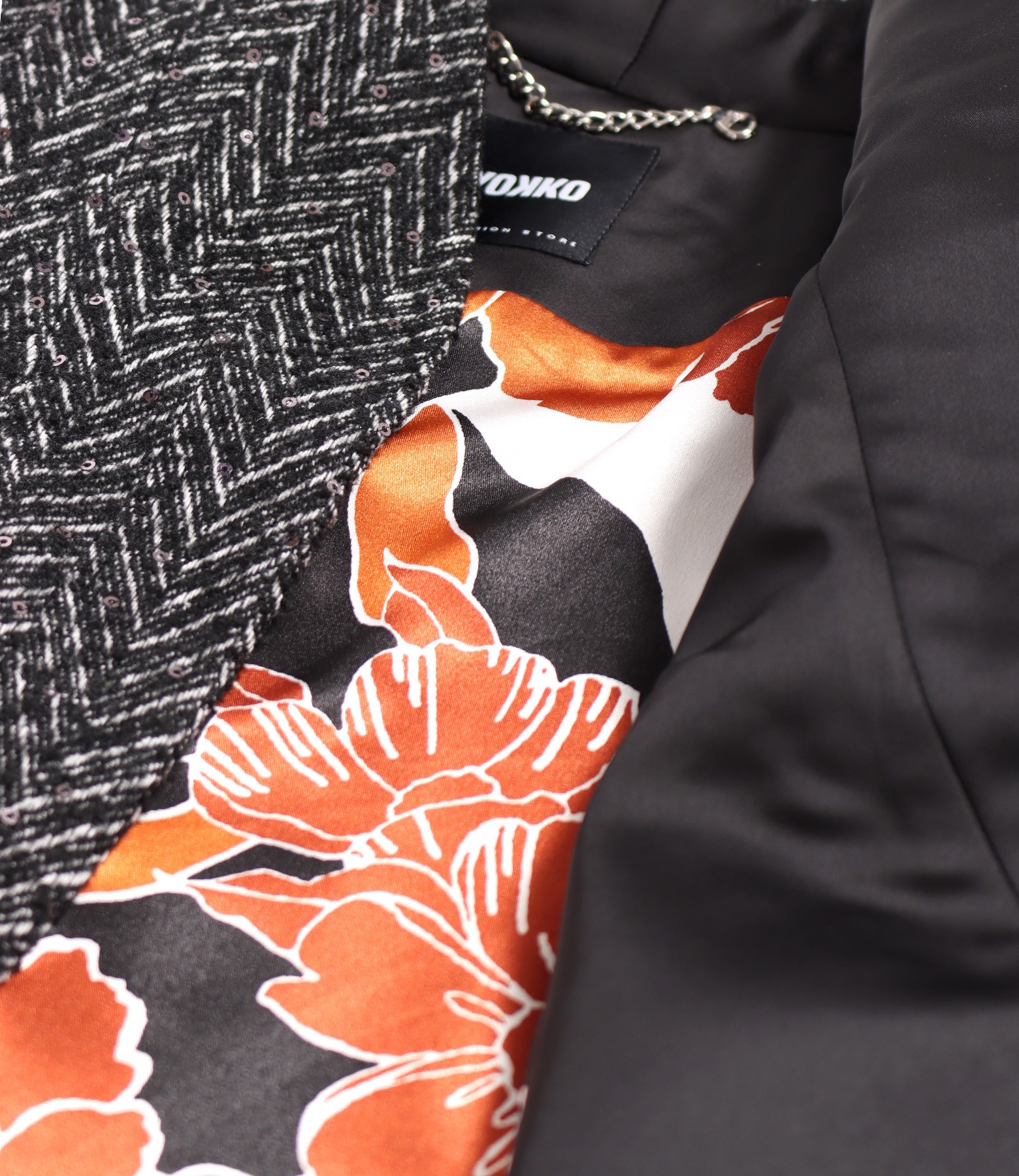 Pardesiu elegant din stofa cu paiete, cu guler gen tunica, buzunare laterale si slit pe spate. Se inchide pe fata cu 4 capse metalice.