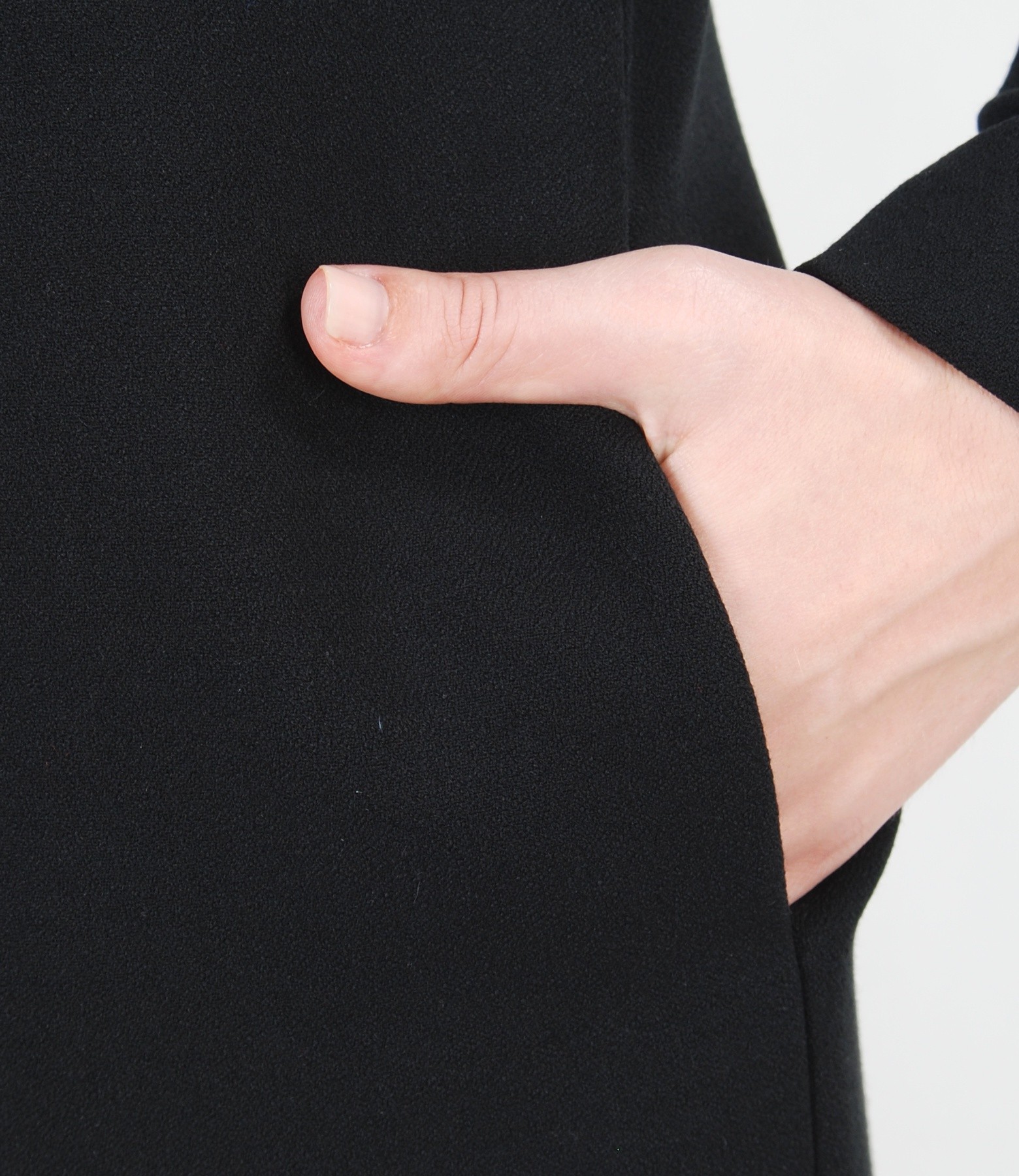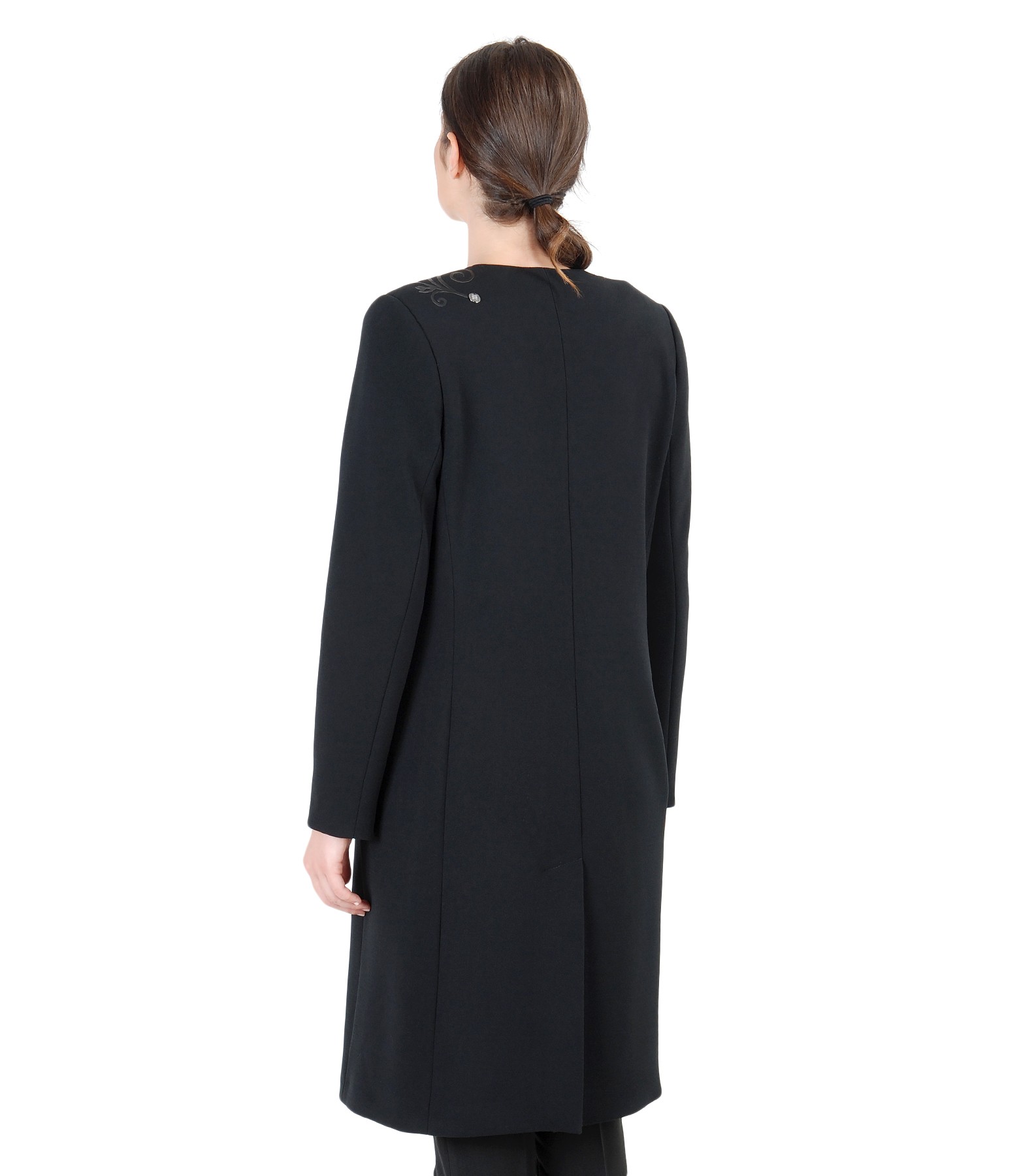 Pardesiu din stofa elastica, fara guler, cu decolteu pe langa gat, buzunare laterale ascunse, garnitura si aplicatie de piele ecologica. Se inchide cu 5 capse mos-baba pana la baza gatului.