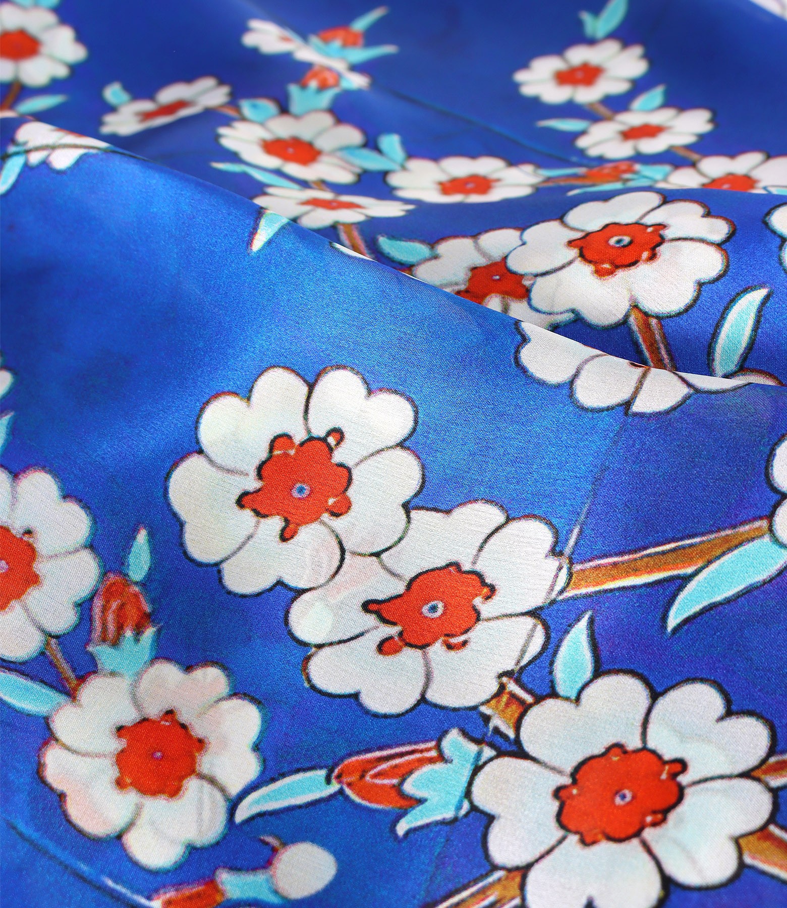 Rochie caftan din matase naturala fina, necaptusita. Este imprimata digital cu motive florale special concepute in Italia, Como. Are cordon detasabil in talie, tip siret gros, cu fir auriu inserat.
