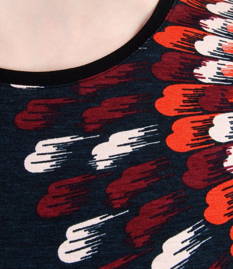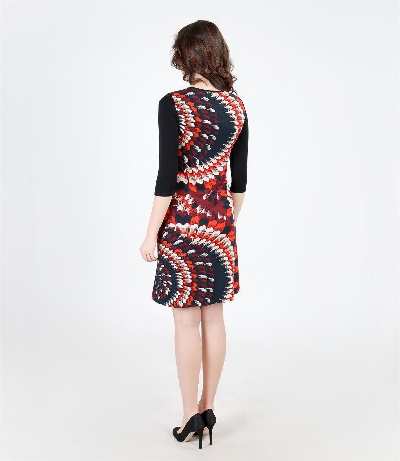 Rochie comoda din jerse elastic imprimat, captusita, usor evazata, cu decolteu rotund si maneci 3/4. Nu are sistem de inchidere. Pozitia imprimeului difera per produs.