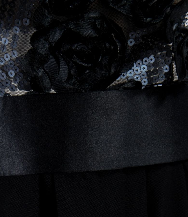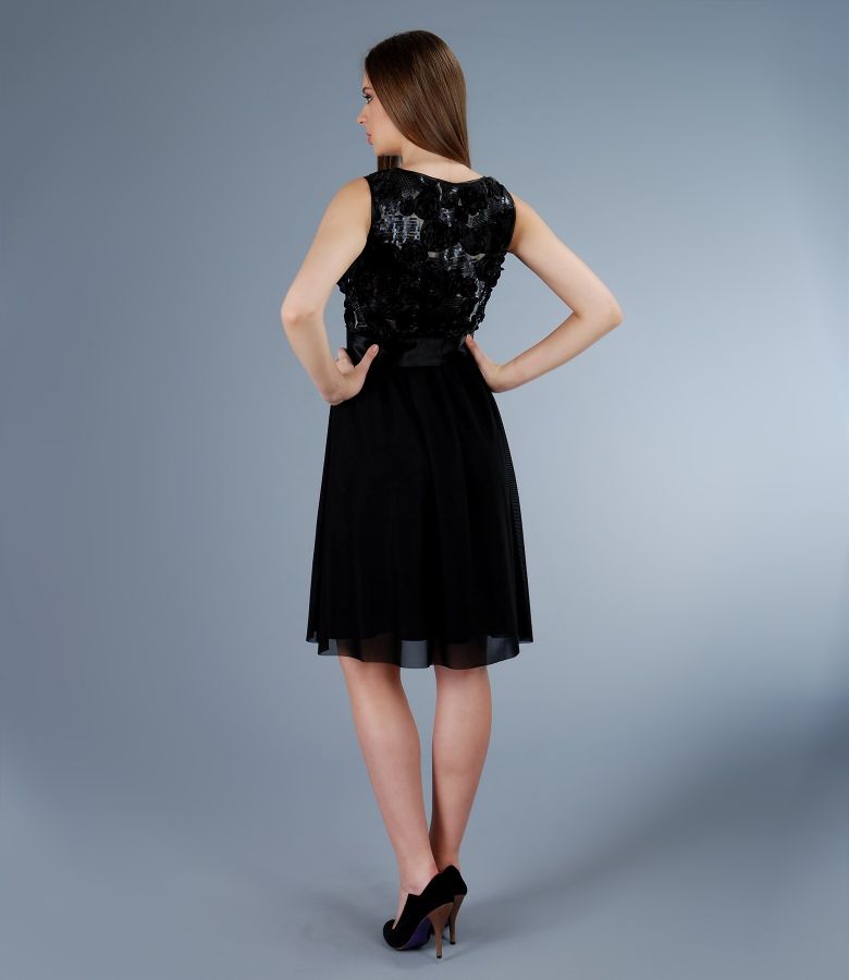 Rochie din tul elastic negru, moale, dublata cu saten elastic in ton. Corsaj din tul cu paiete negru-sidefat si motive floale, dublat cu saten elastic nude. Cordon de saten in talie, detasabil, inchis cu doua capse mos-baba. Se inchide cu fermoar ascuns pe lateral stanga.
