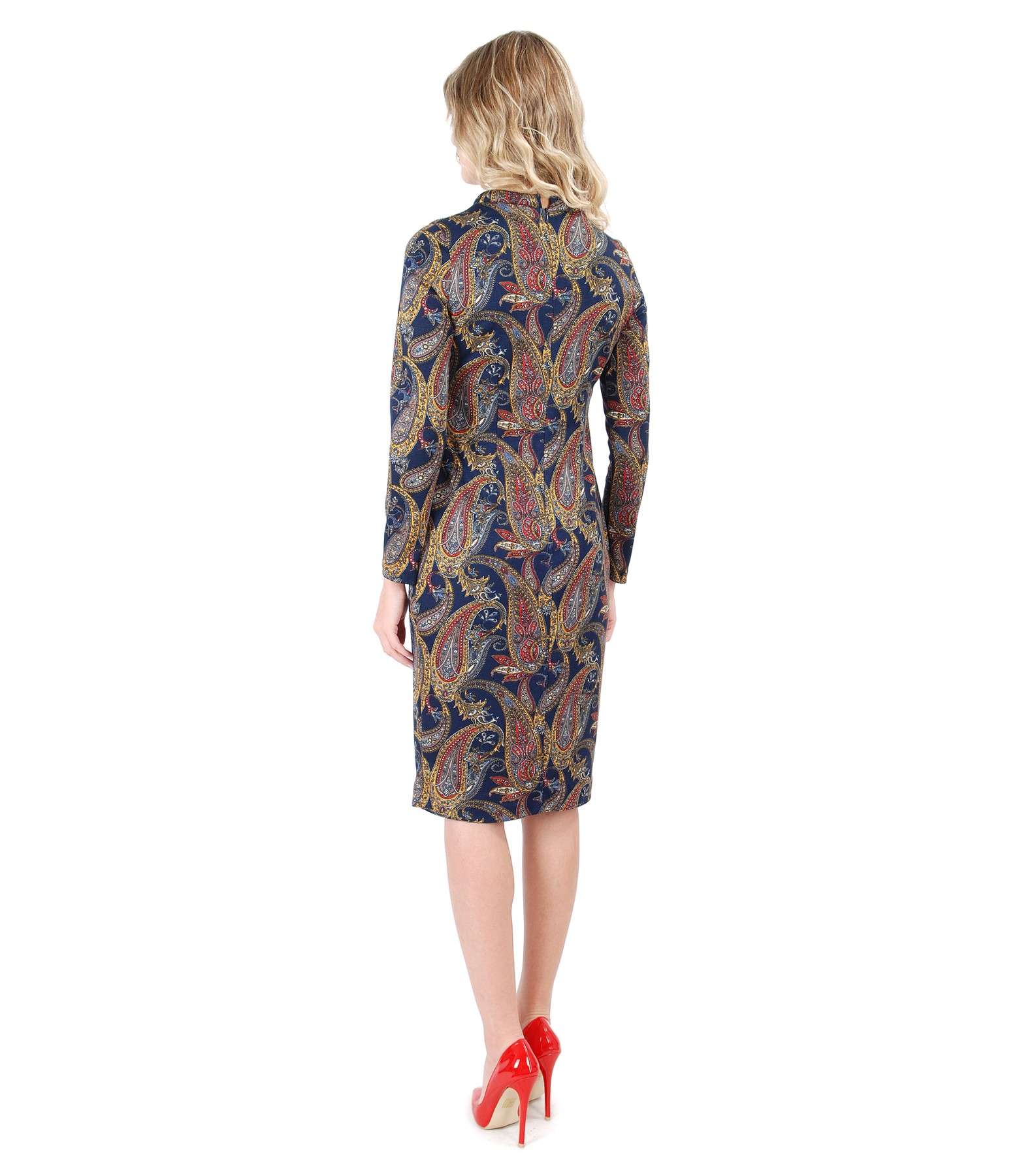 Rochie din jerse elastic gros imprimat cu motive florale, captusita, cu maneci lungi si guler tubular la baza gatului. Se inchide cu fermoar ascuns pe mijloc spate.