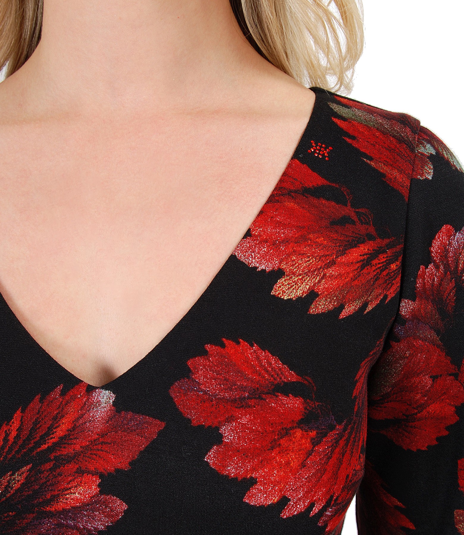 Rochie midi, captusita, imprimata cu motive florale, cu decolteu in V si maneci lungi cu mansete. Se inchide cu fermoar ascuns pe mijloc spate.