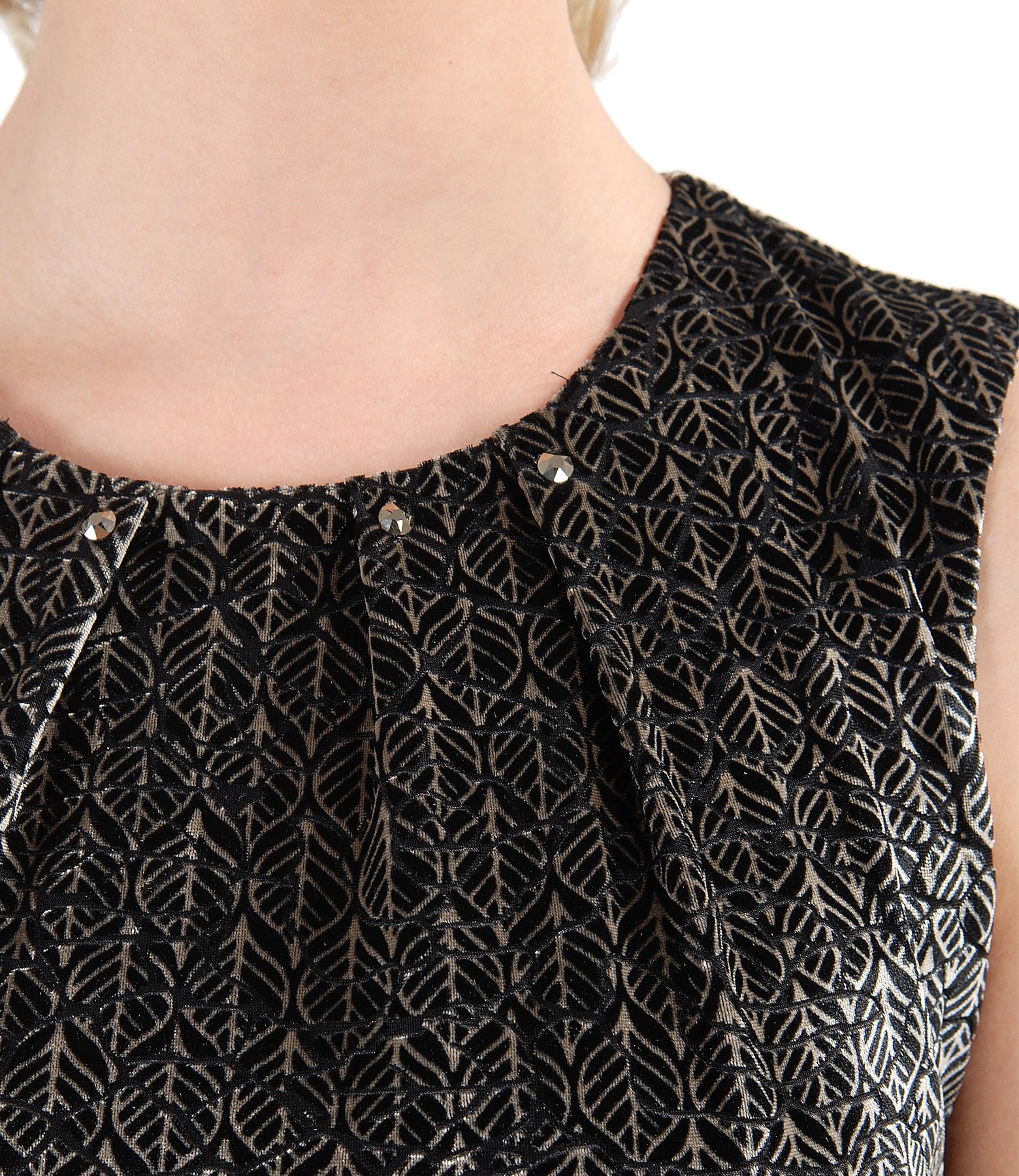 Rochie din catifea imprimata in relief, captusita, fara maneci, cu decolteul rotund cu pliuri si aplicatie de cristale pe decolteu. Se inchide cu un nasture pe mijloc spate.