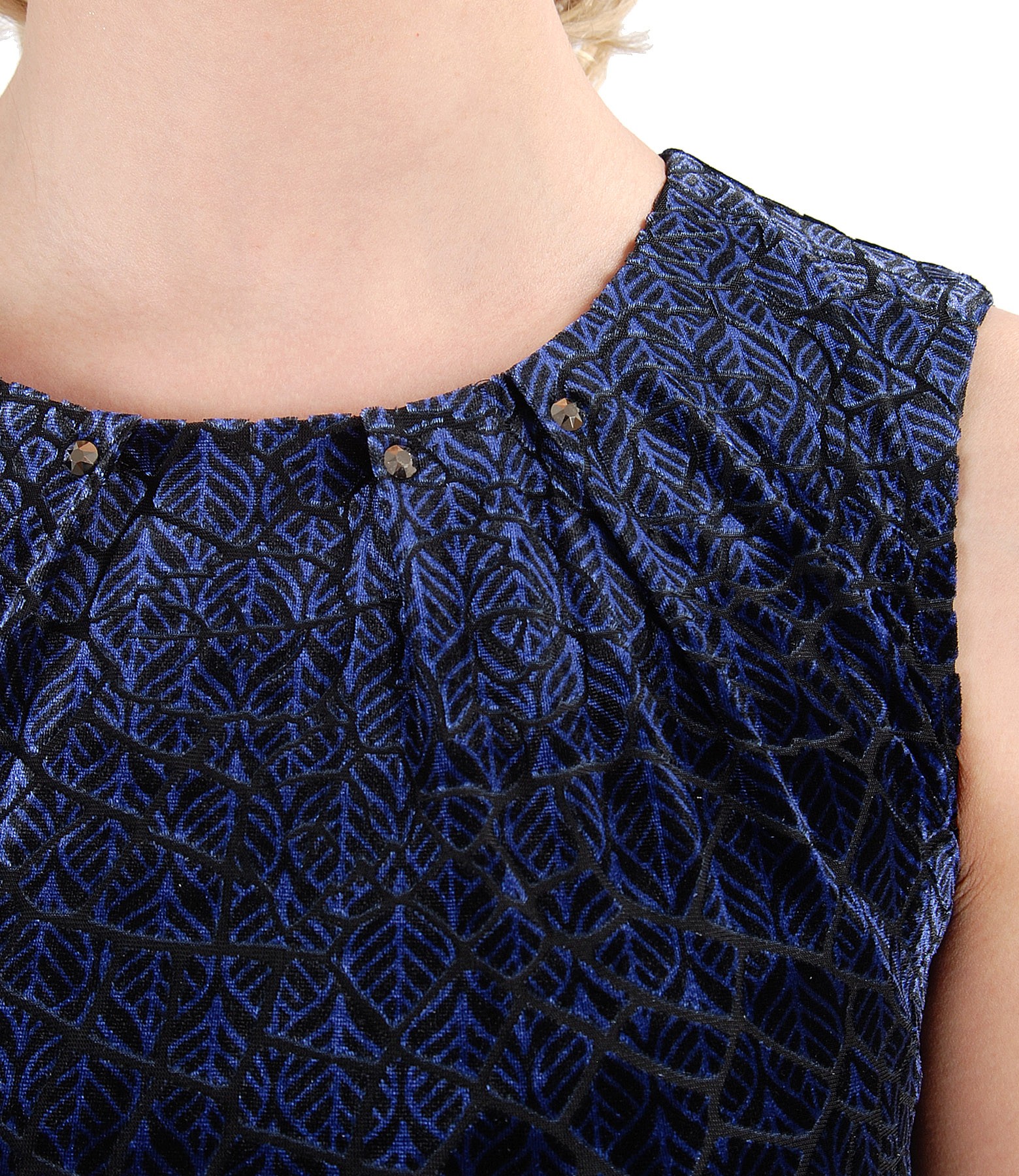 Rochie din catifea imprimata in relief, captusita, fara maneci, cu decolteul rotund cu pliuri si aplicatie de cristale pe decolteu. Se inchide cu un nasture pe mijloc spate.