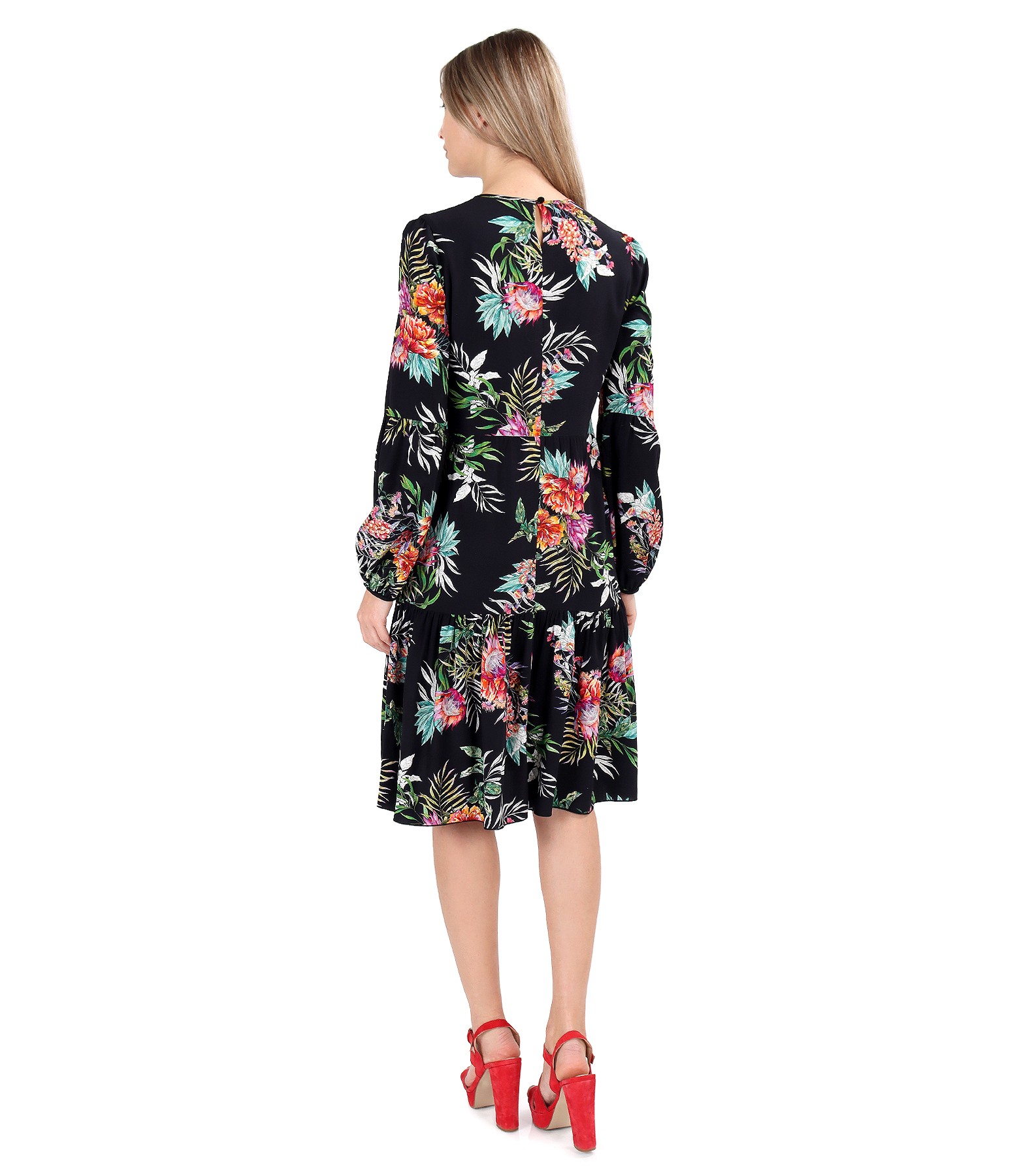Rochie cu volane din viscoza imprimata cu motive florale, necaptusita, cu maneci lungi si decolteu rotund. Se inchide cu un nasture pe mijloc spate.