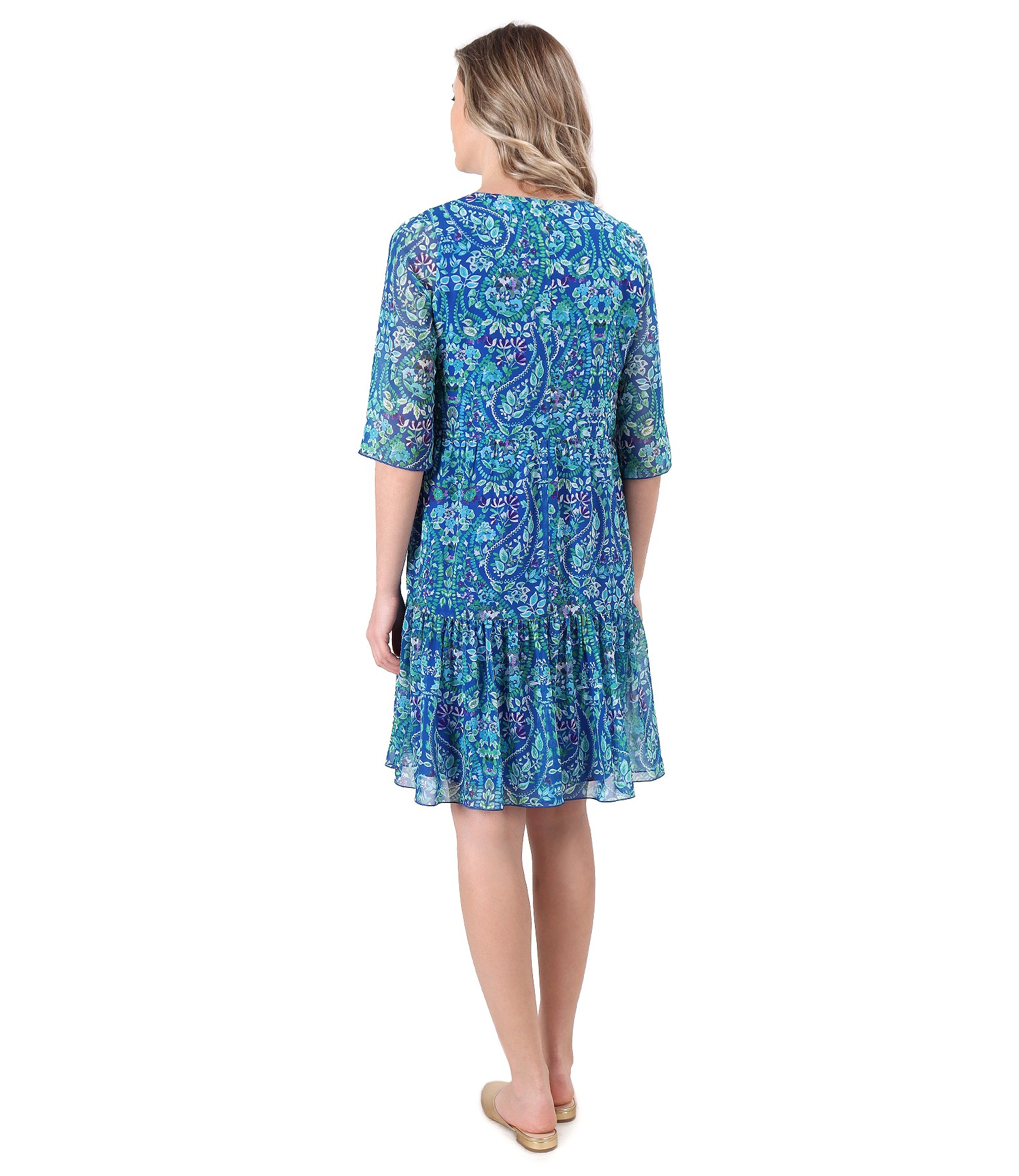 Rochie cu volane din voal imprimat cu motive florale, dublata cu viscoza, cu maneci 3/4 si decolteu rotund. Nu are sistem de inchidere.