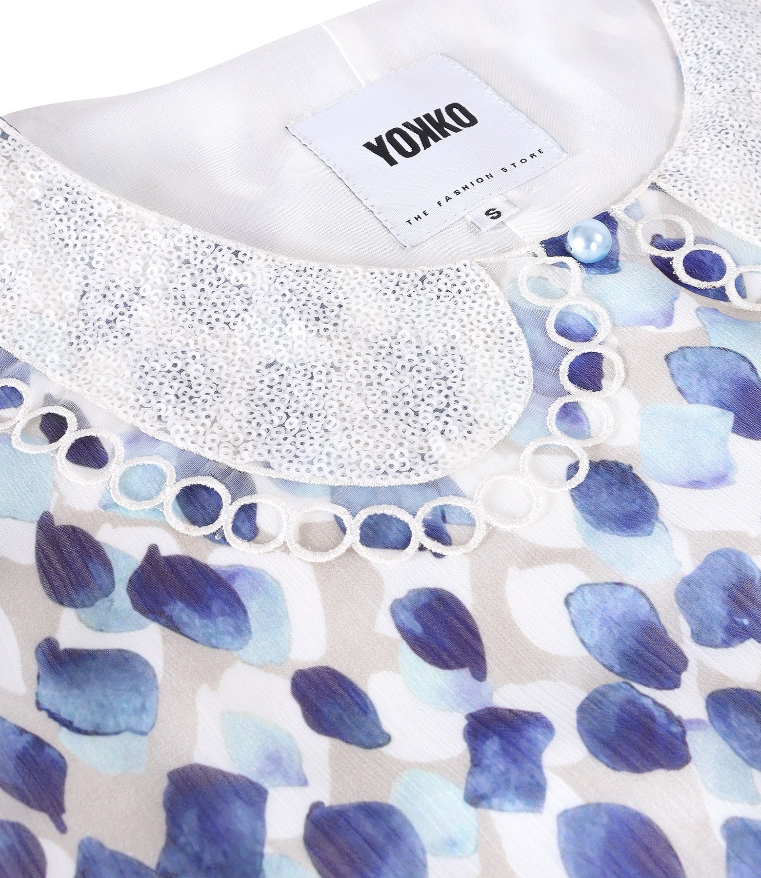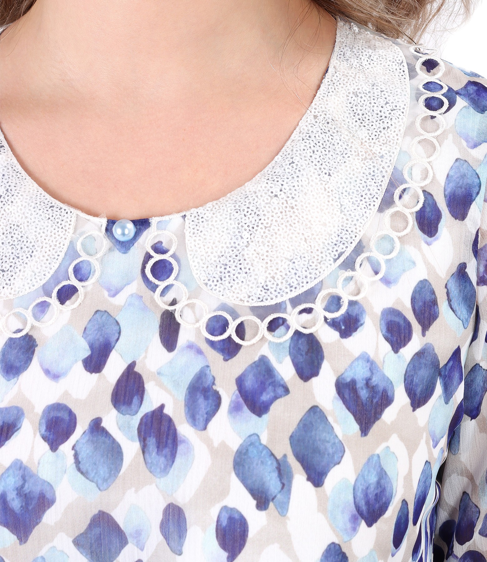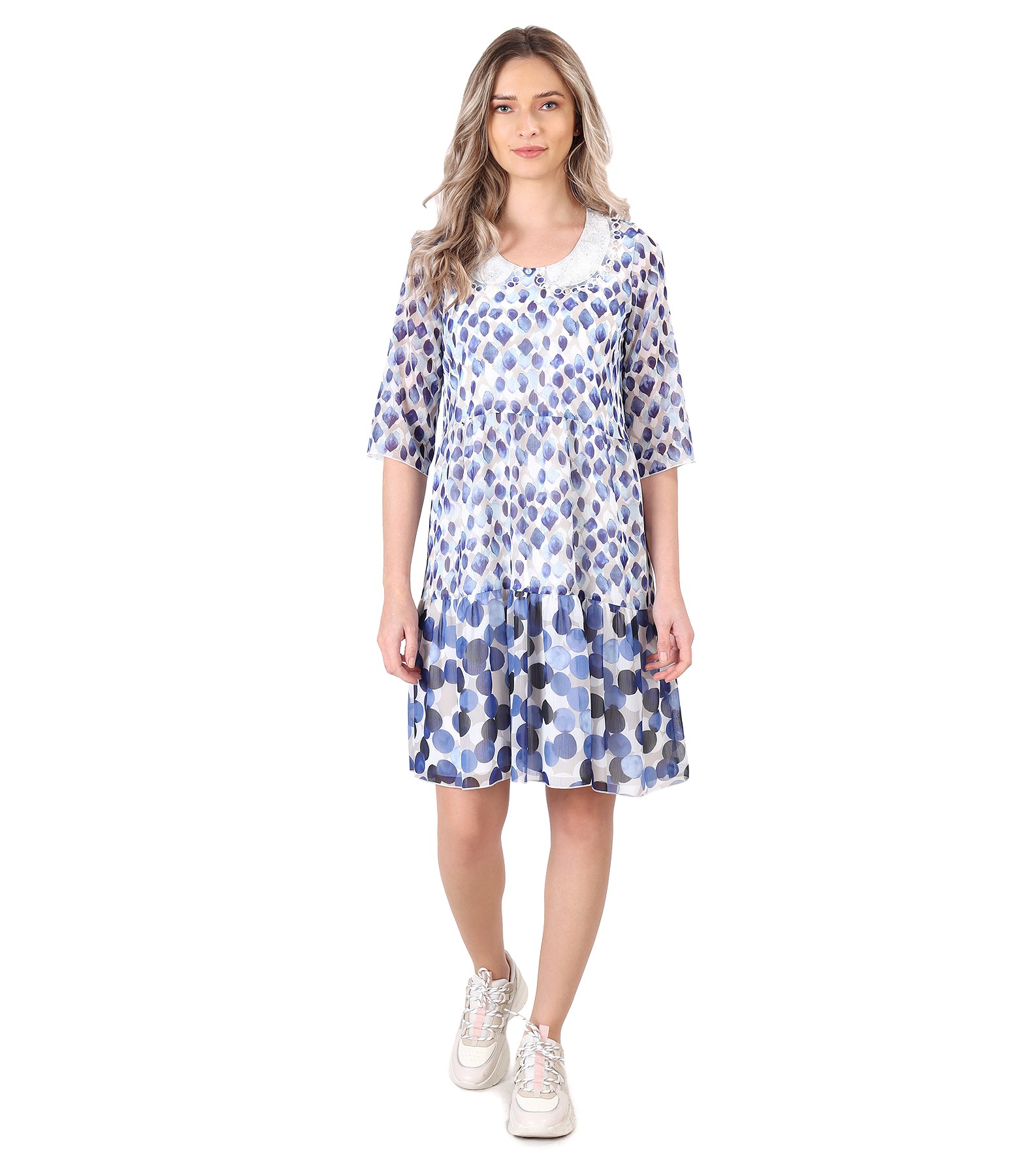 Rochie cu volane din voal imprimat cu guler rotund (Albastru), marimea