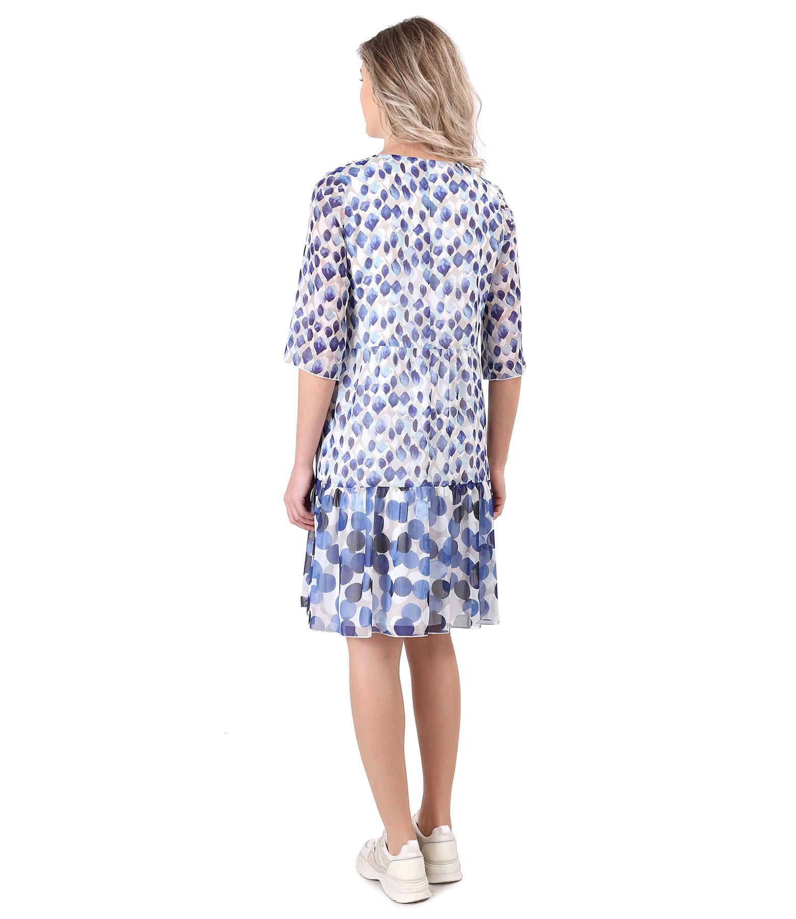 Rochie cu volane din voal imprimat digital, dublata cu viscoza, cu maneci 3/4 si cu guler rotund. Nu are sistem de inchidere.