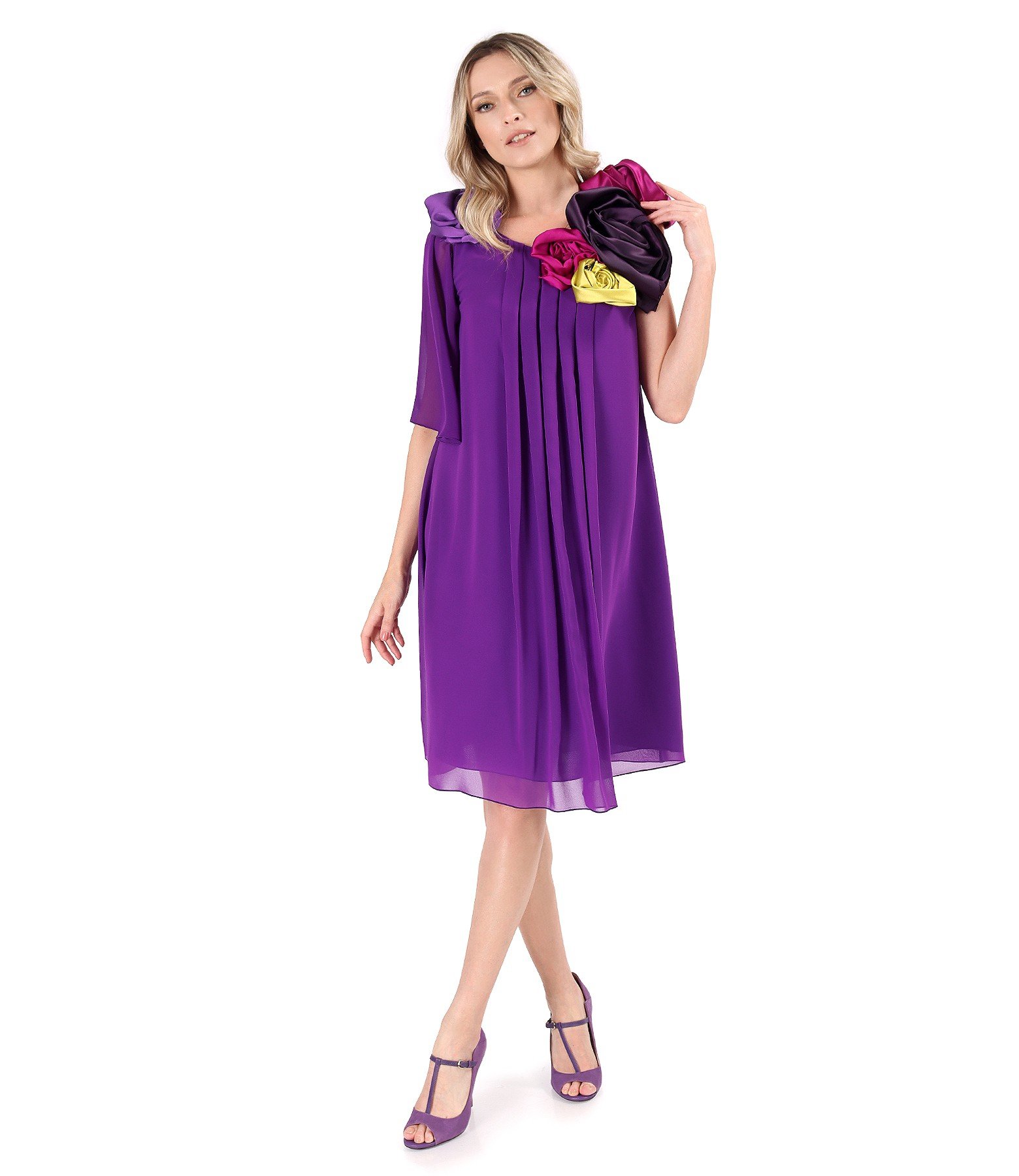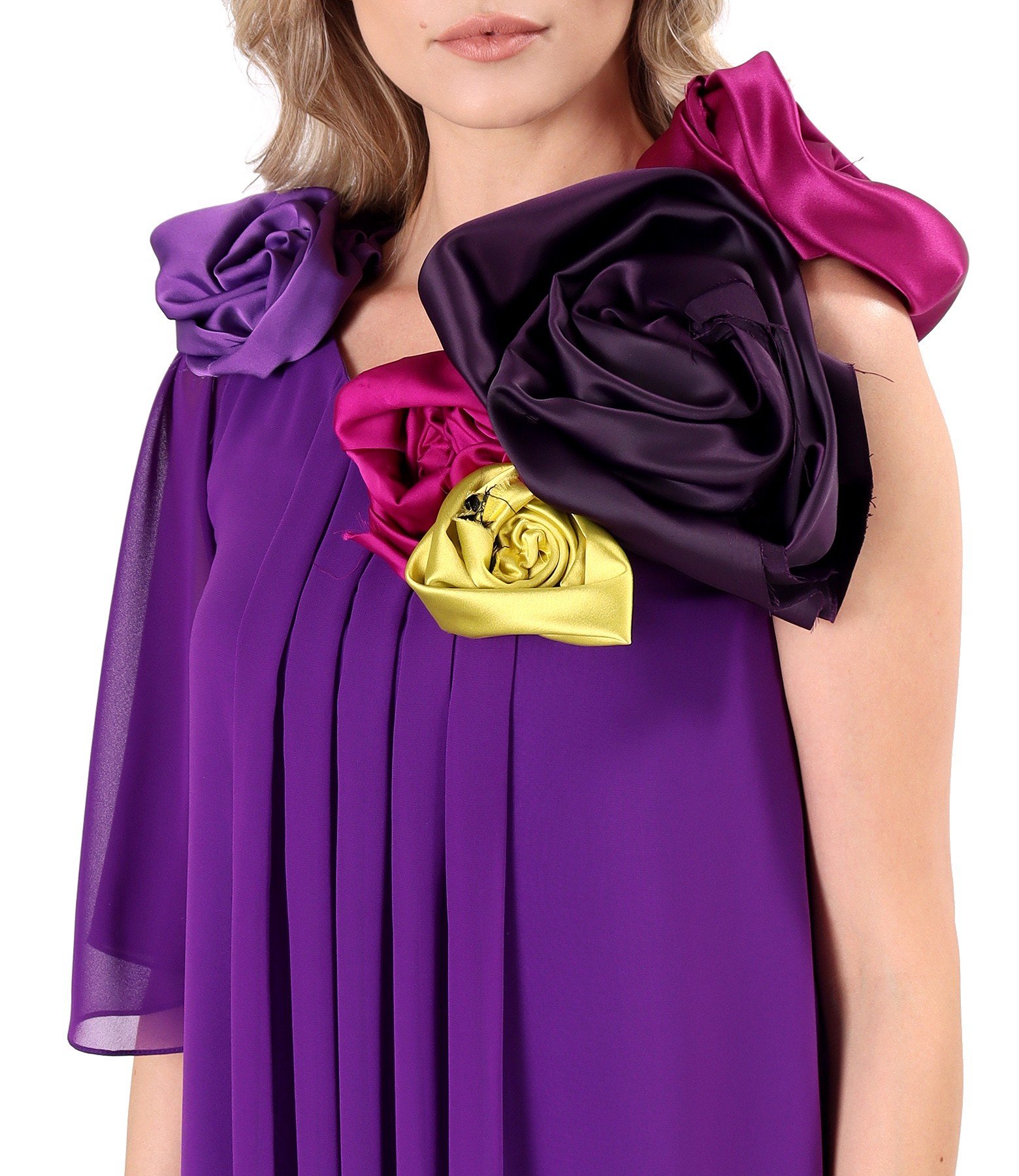 Rochie de ocazie din voal cu flori din saten la decolteu (Mov), marimea