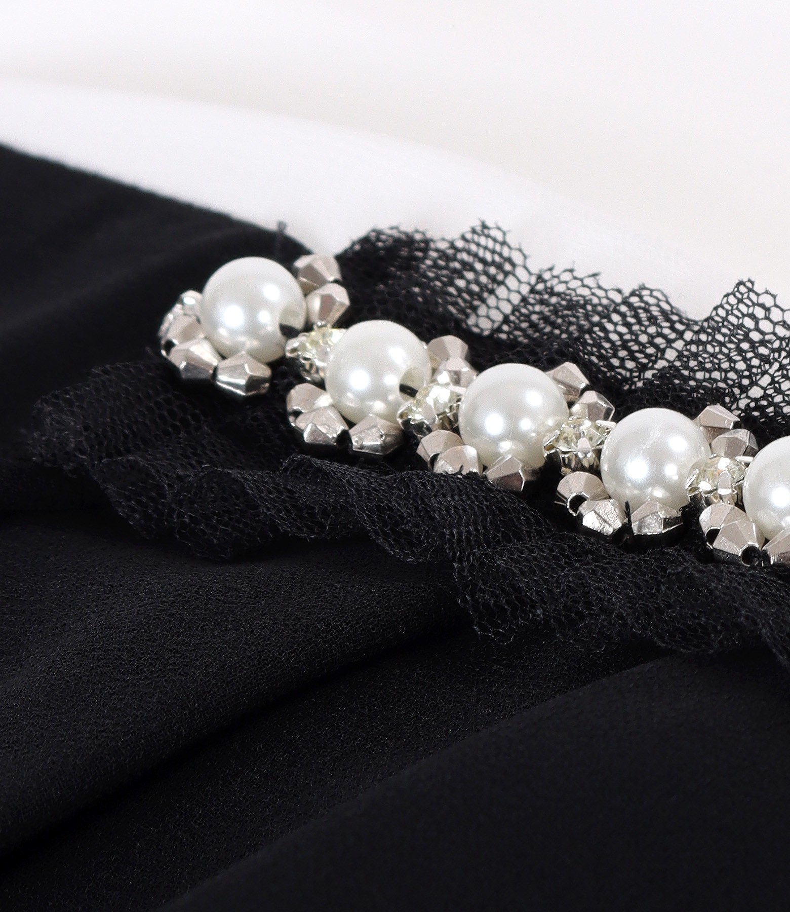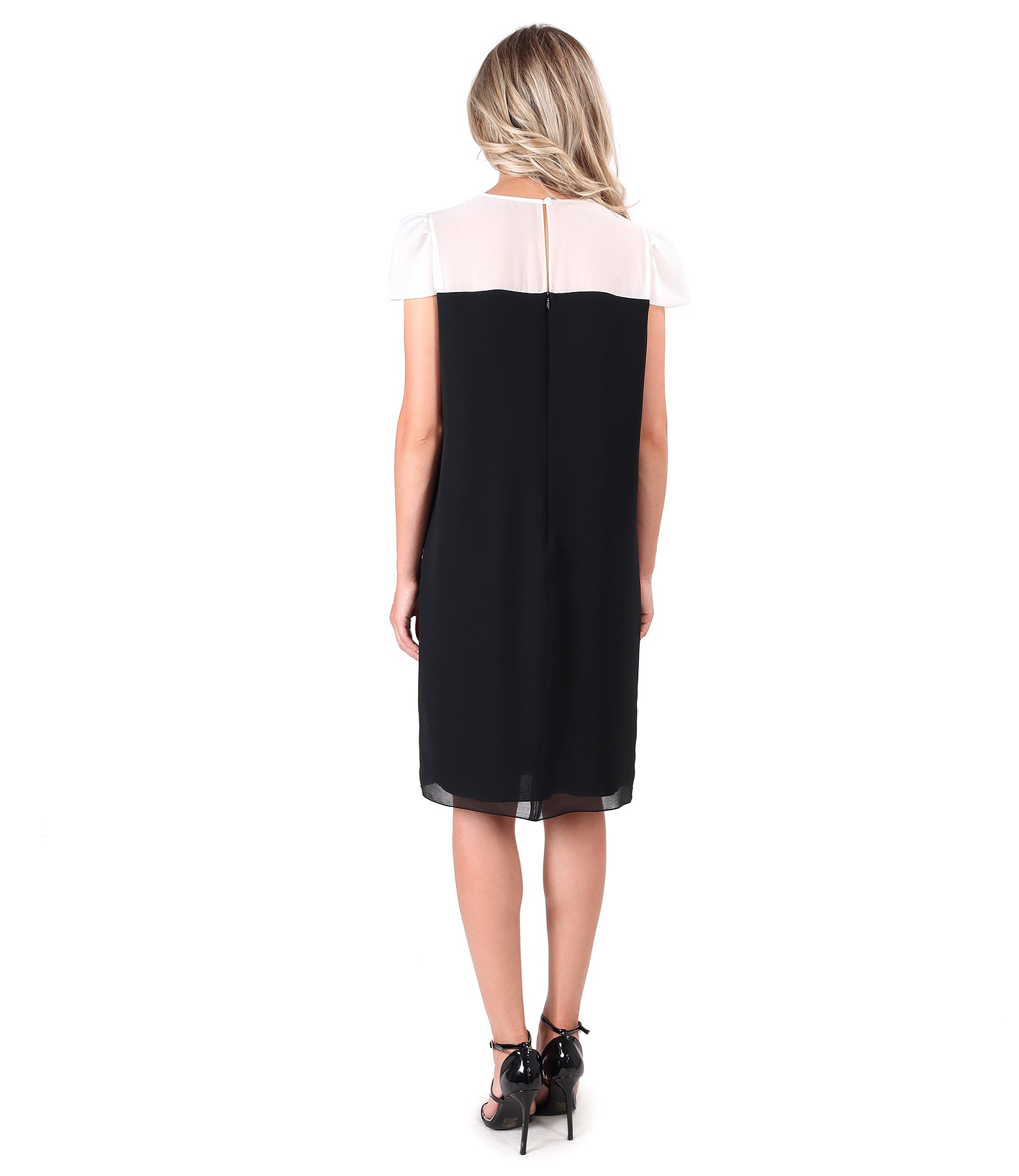 Rochie de ocazie din voal in doua culori, alb si negru, dublata cu viscoza, cu maneci scurte si pasmanterie pe fata. Se inchide cu un nasture si cu fermoar pe mijloc spate.