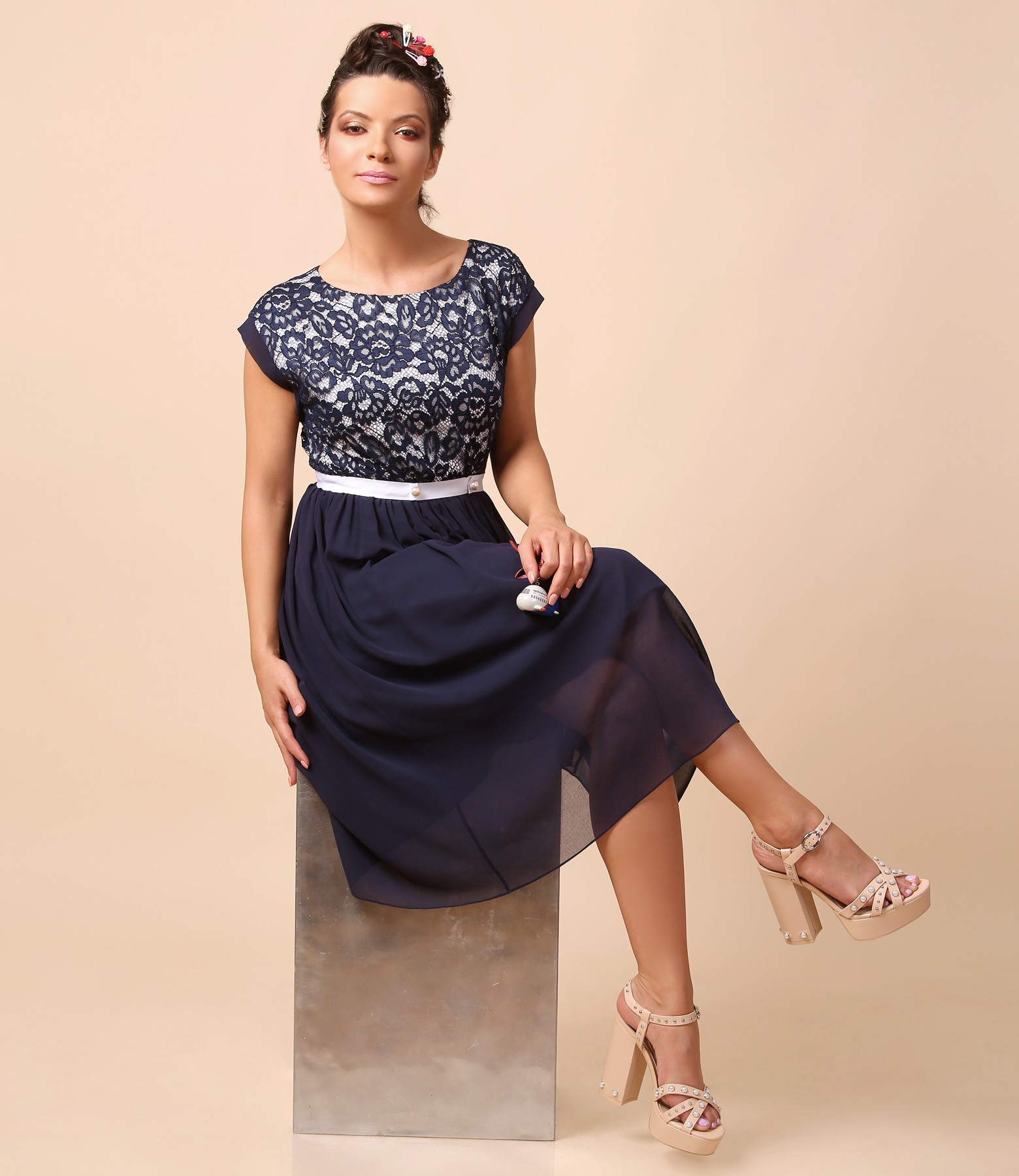 Rochie de seara cu dantela cu motive florale si perle (Bleumarin), marimea