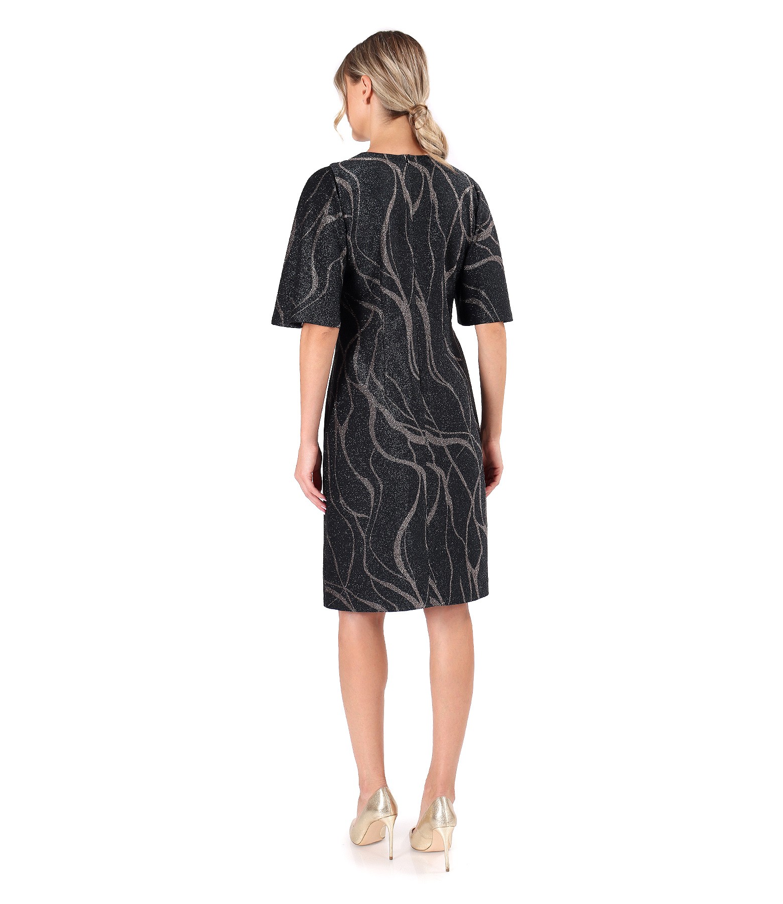 Rochie de seara cu maneci ample, din stofa elastica, cu viscoza, usor lucioasa, cu decolteu adanc in V. Se inchide cu fermoar ascuns pe mijloc spate.