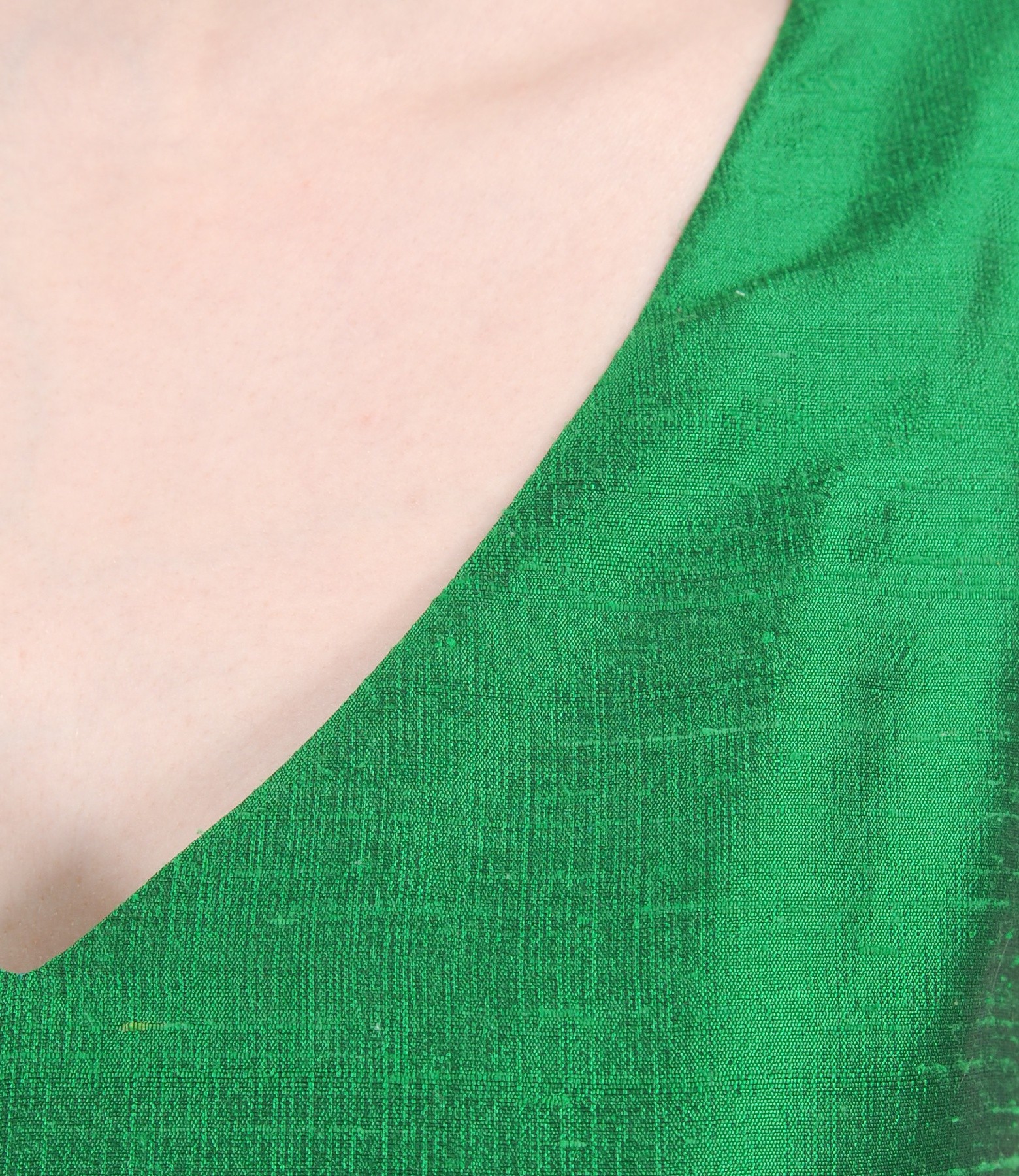 Rochie de seara scurta din tafta de matase, fara maneci, cu decolteul in V. Se strange in talie cu un cordon detasabil cu cristale. Se inchide cu fermoar ascuns pe mijloc spate.