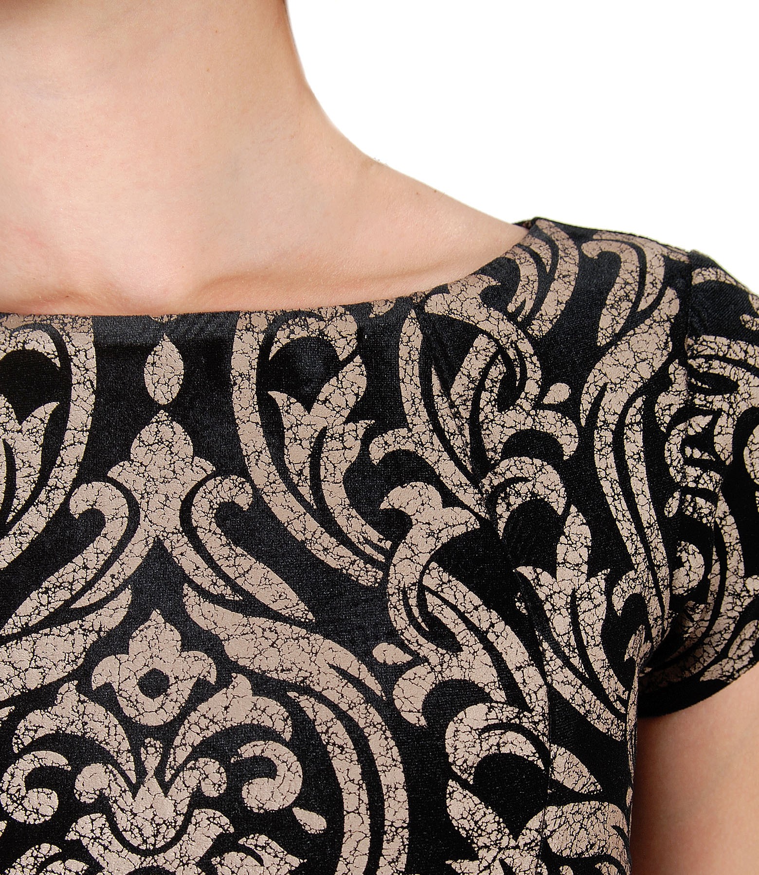 Rochie de seara cambrata, din catifea elastica imprimata, captusita, cu decolteu rotund si maneci scurte. Se inchide cu fermoar ascuns pe mijloc spate.