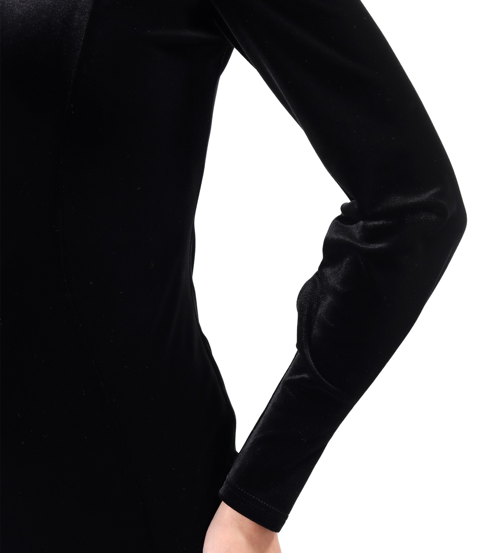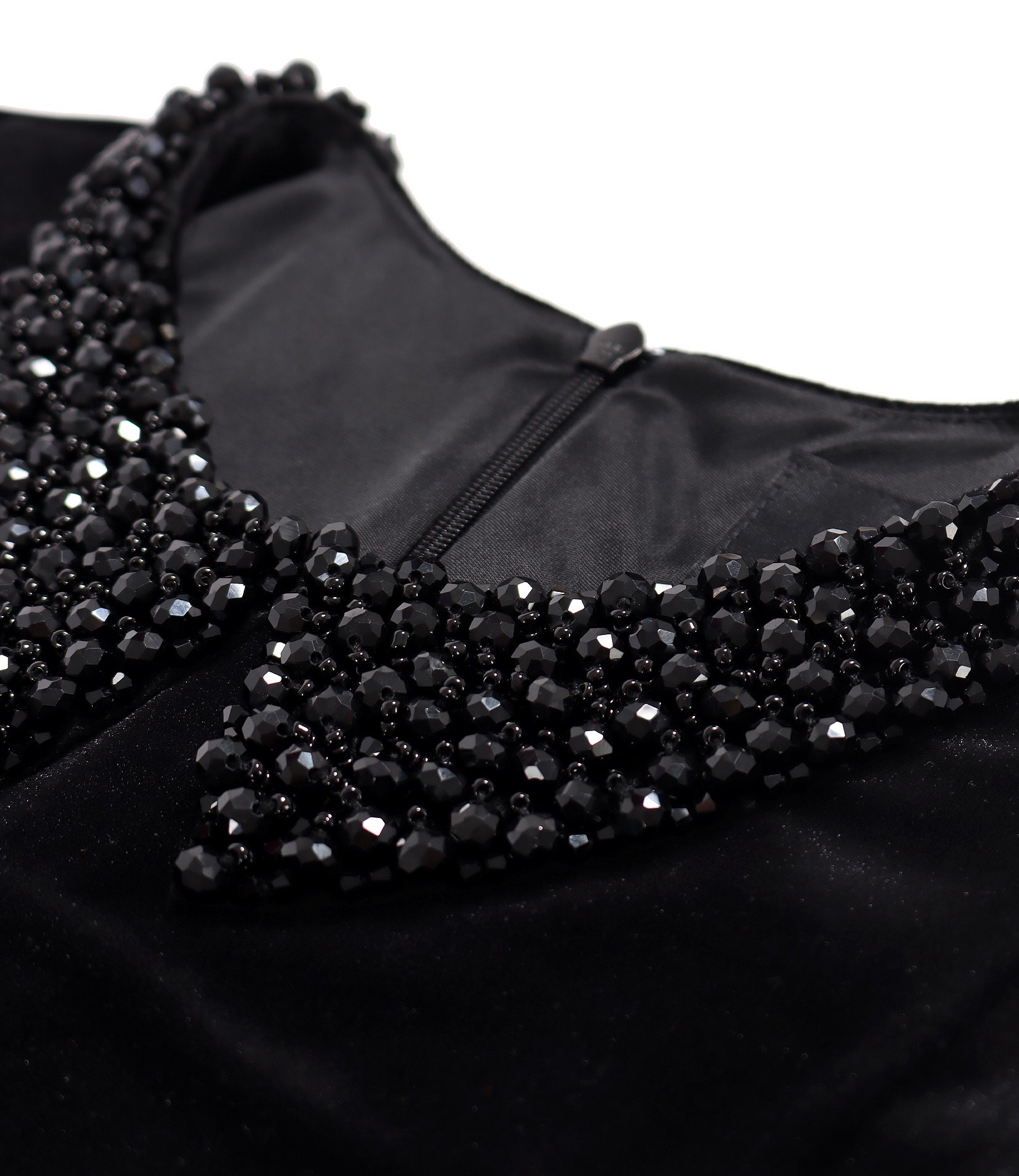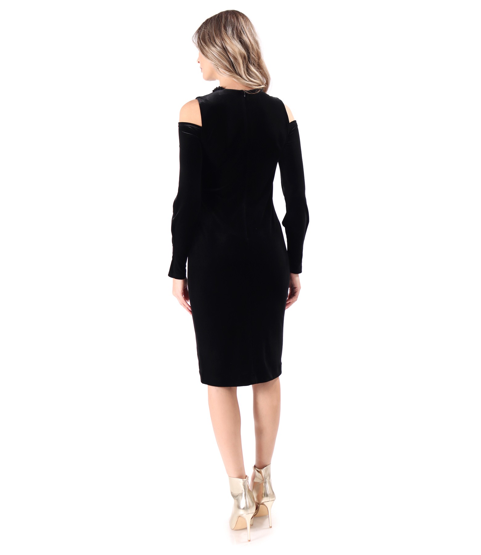 Rochie de seara din catifea elastica neagra cu umerii goi, captusita, maneci lungi usor bufante, si cu guler ascutit cu pietre negre. Se inchide cu fermoar ascuns pe mijloc spate.