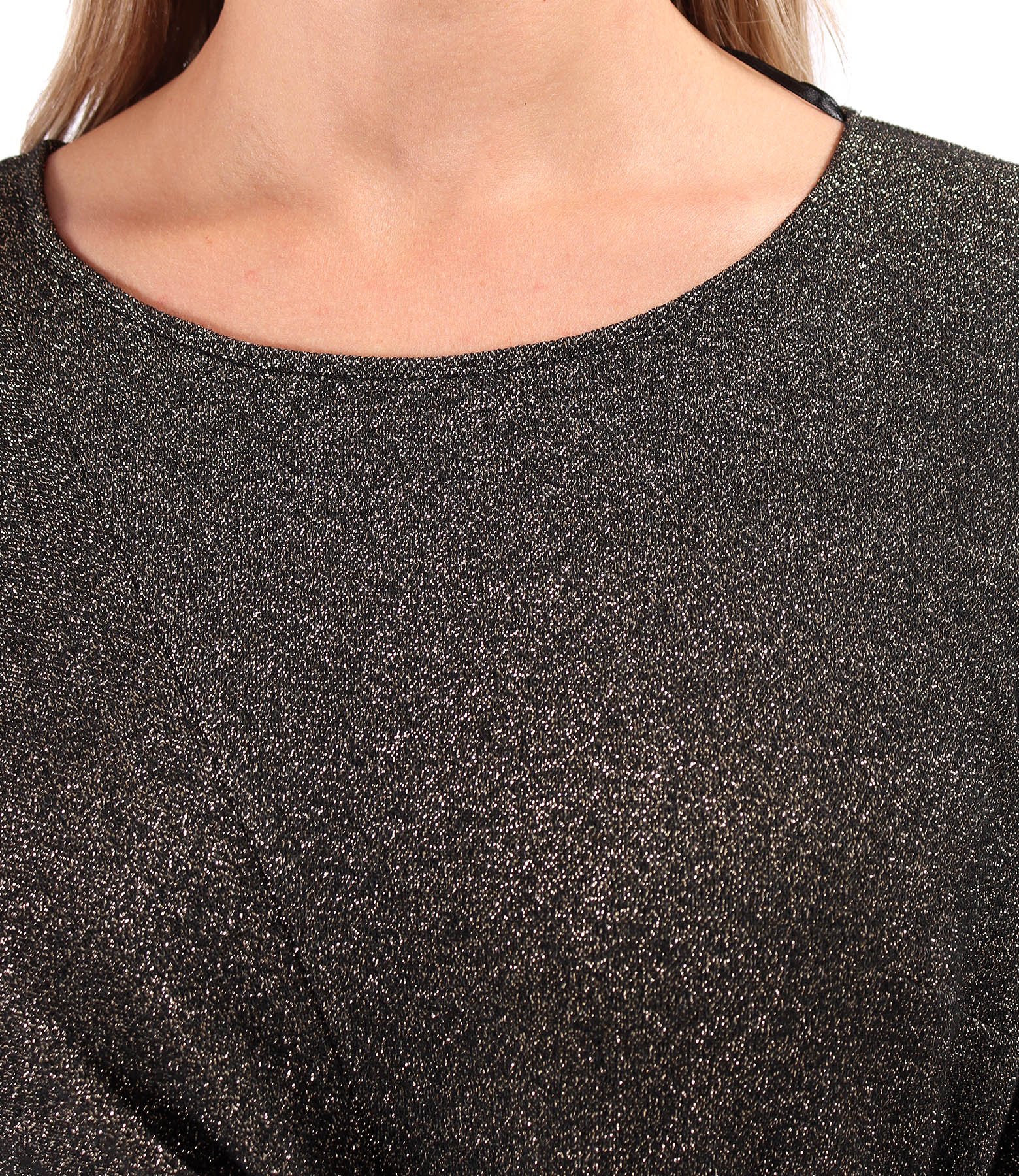 Rochie midi de seara din jerse elastic cu fir metalic auriu, cu maneci lungi, decolteu rotund si cordon in talie.