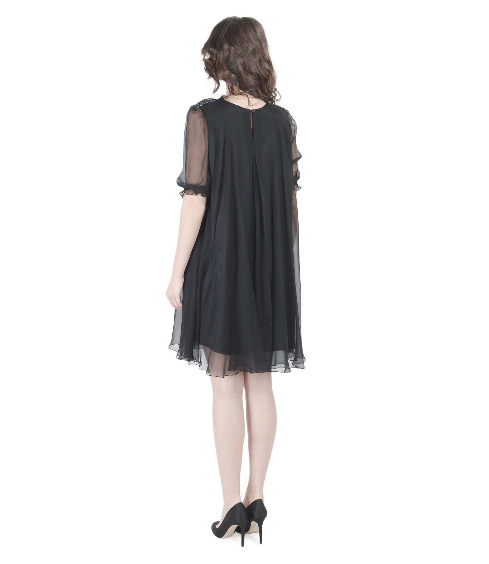Rochie evazata din matase, cu maneci bufante si aplicatie pe decolteul rotund, dublata cu saten. Se inchide cu un nasture pe spate.
