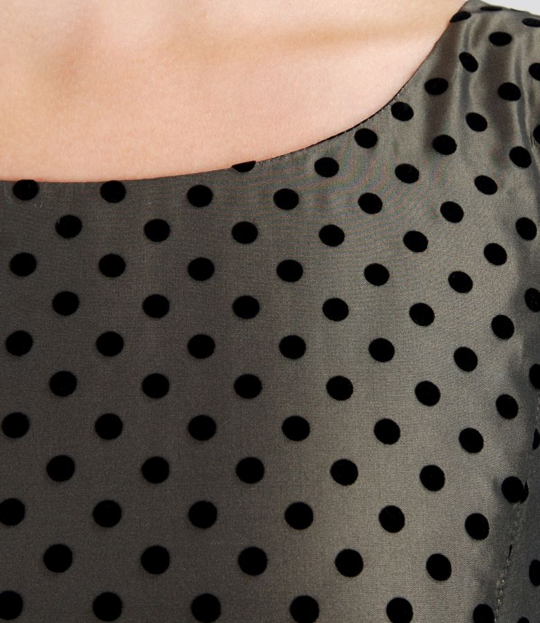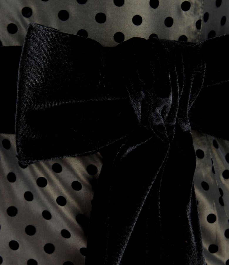 Rochie din tafta cu picouri de catifea, cu decolteu rotund, clini laterali fata si spate si cordon detasabil de catifea cu funda in talie. Se inchide cu fermoar ascuns pe mijloc spate.