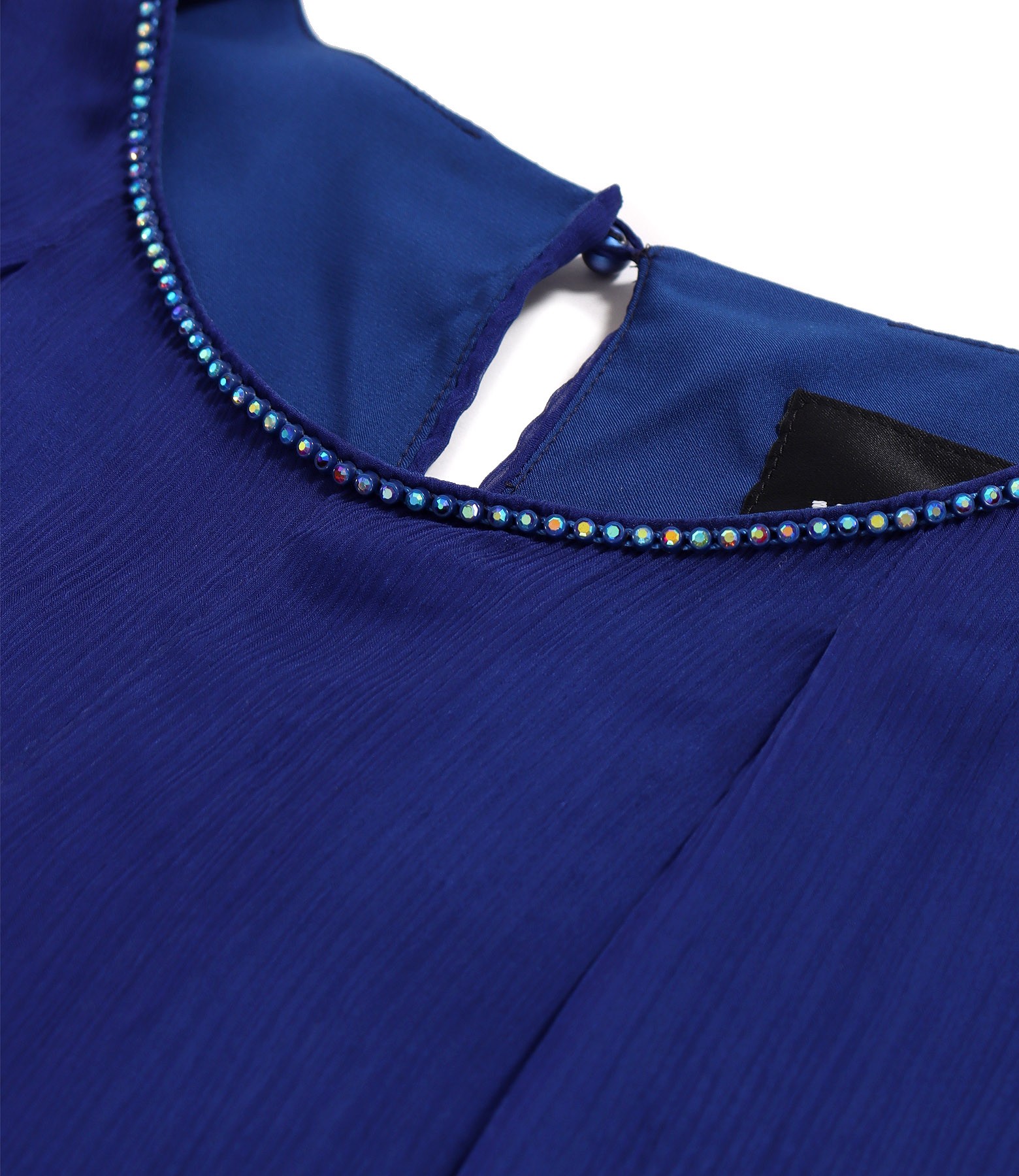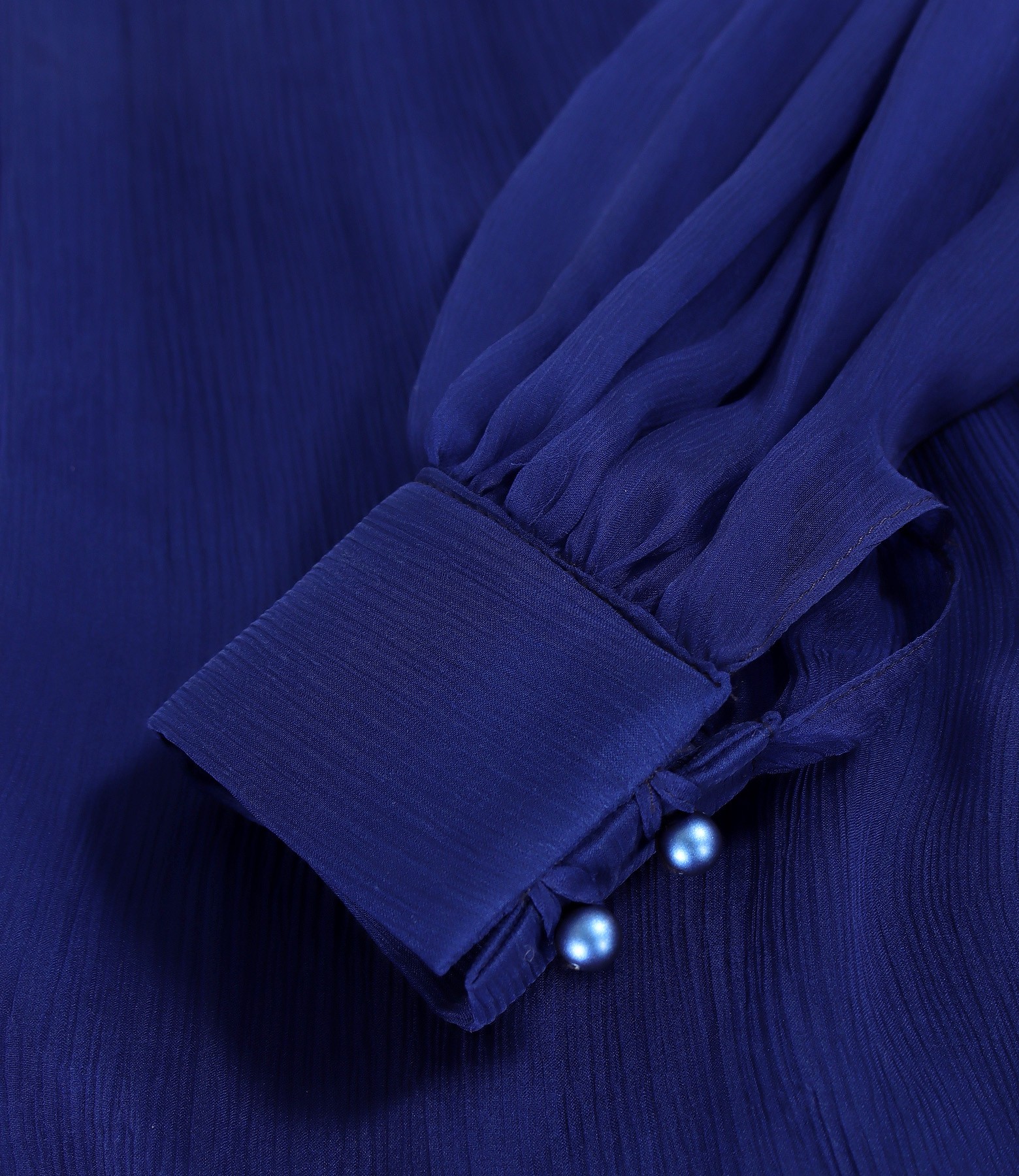 Rochie de seara din voal de matase naturala, dublata cu saten, cu maneci lungi incretite cu mansete cu 2 nasturi si cu aplicatie de cristale pe decolteul rotund. Se inchide cu un nasture pe spate.