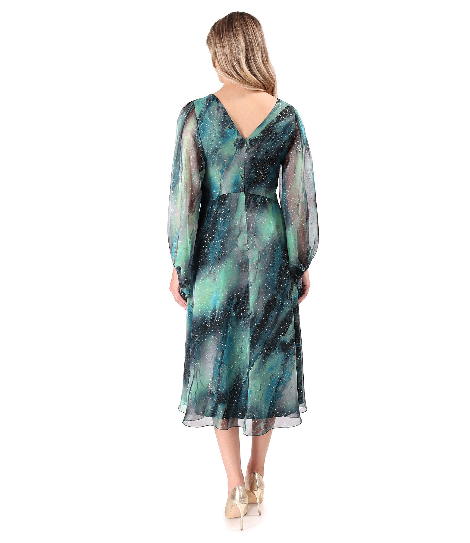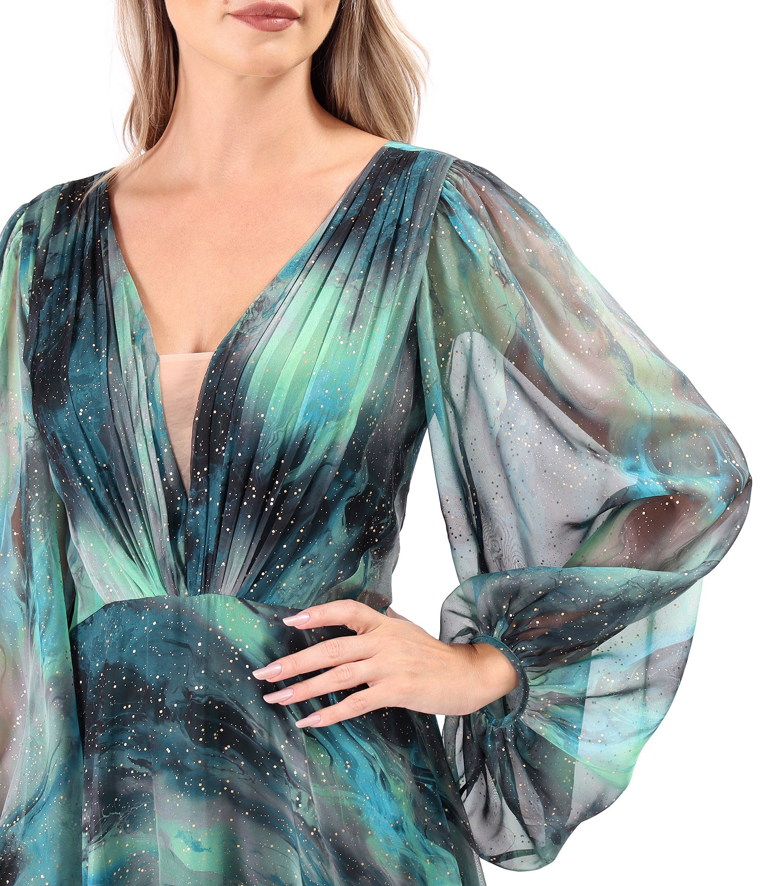Rochie de seara din voal imprimat si cu motive aurii, cu maneci lungi, ample, incretite la terminatii si decolteu adanc in V. Se inchide cu fermoar ascuns pe mijloc spate.