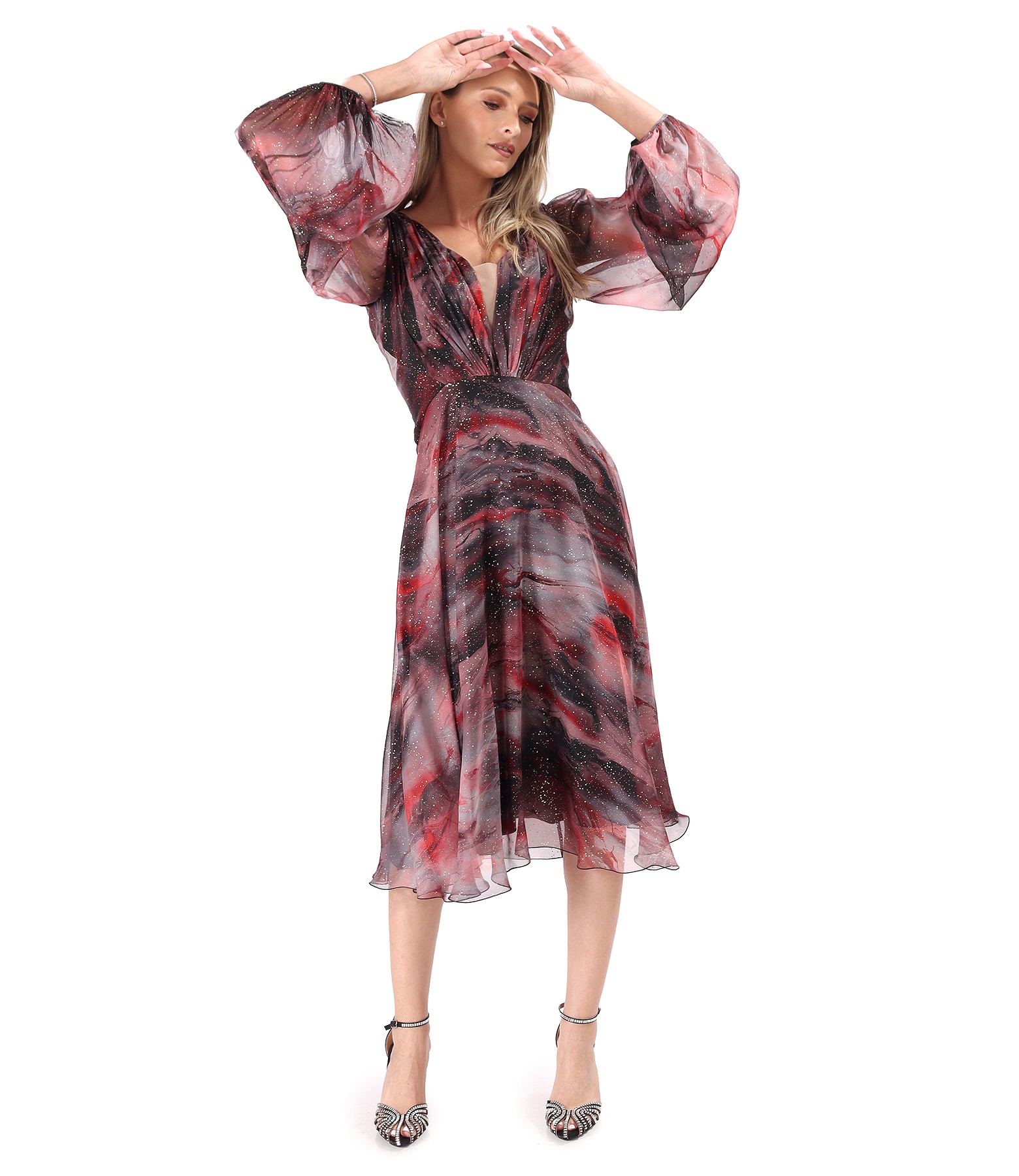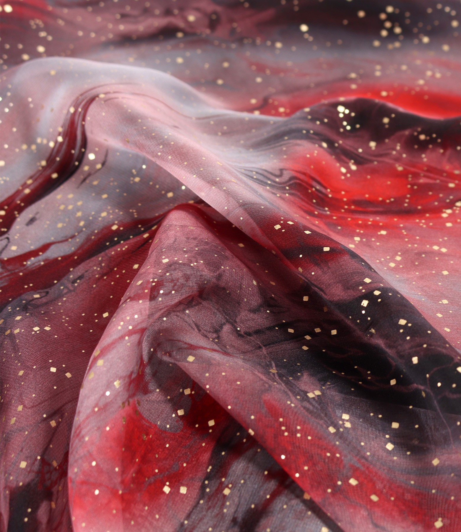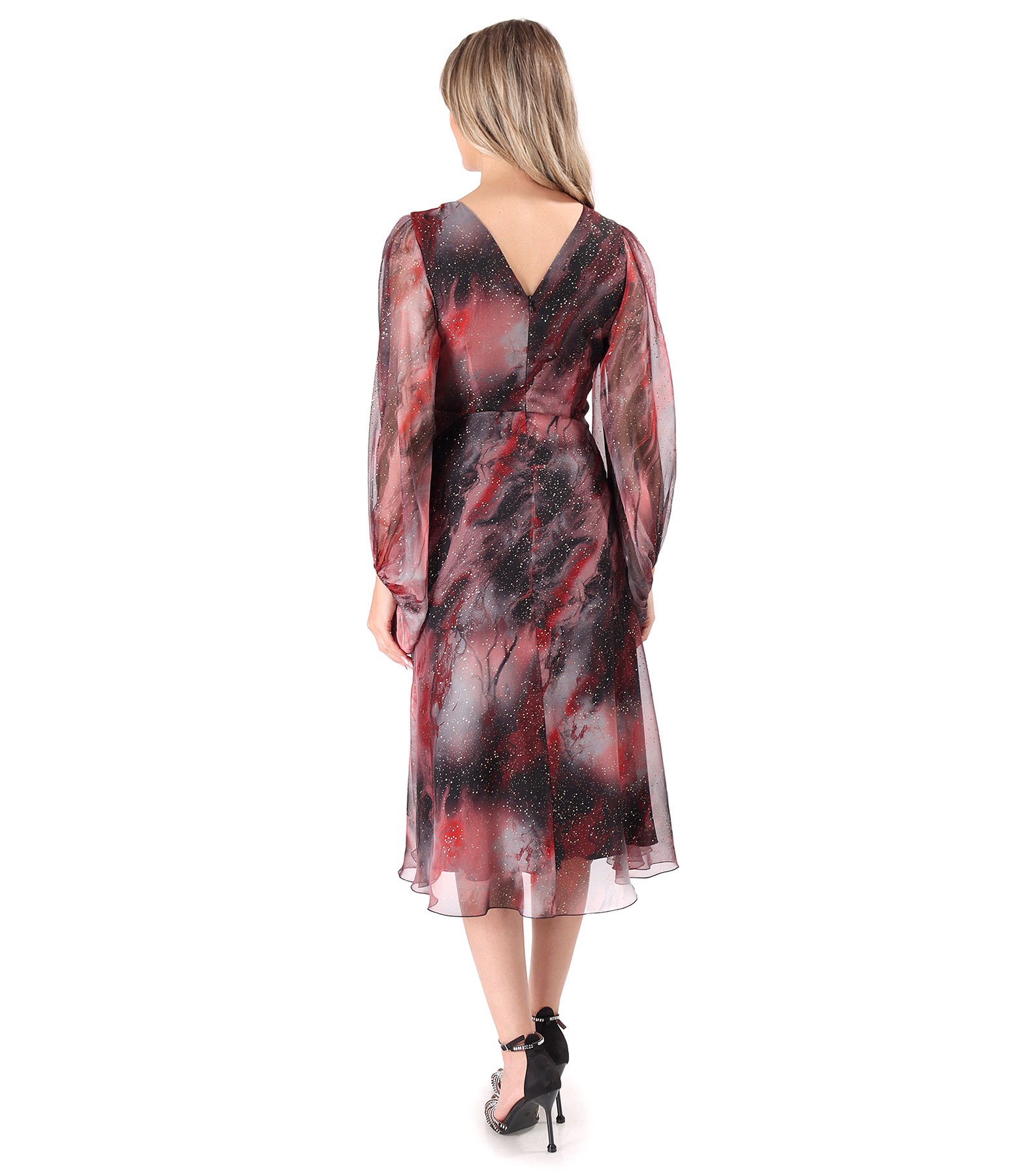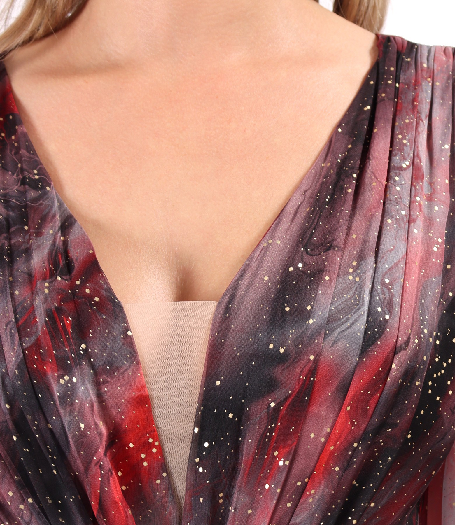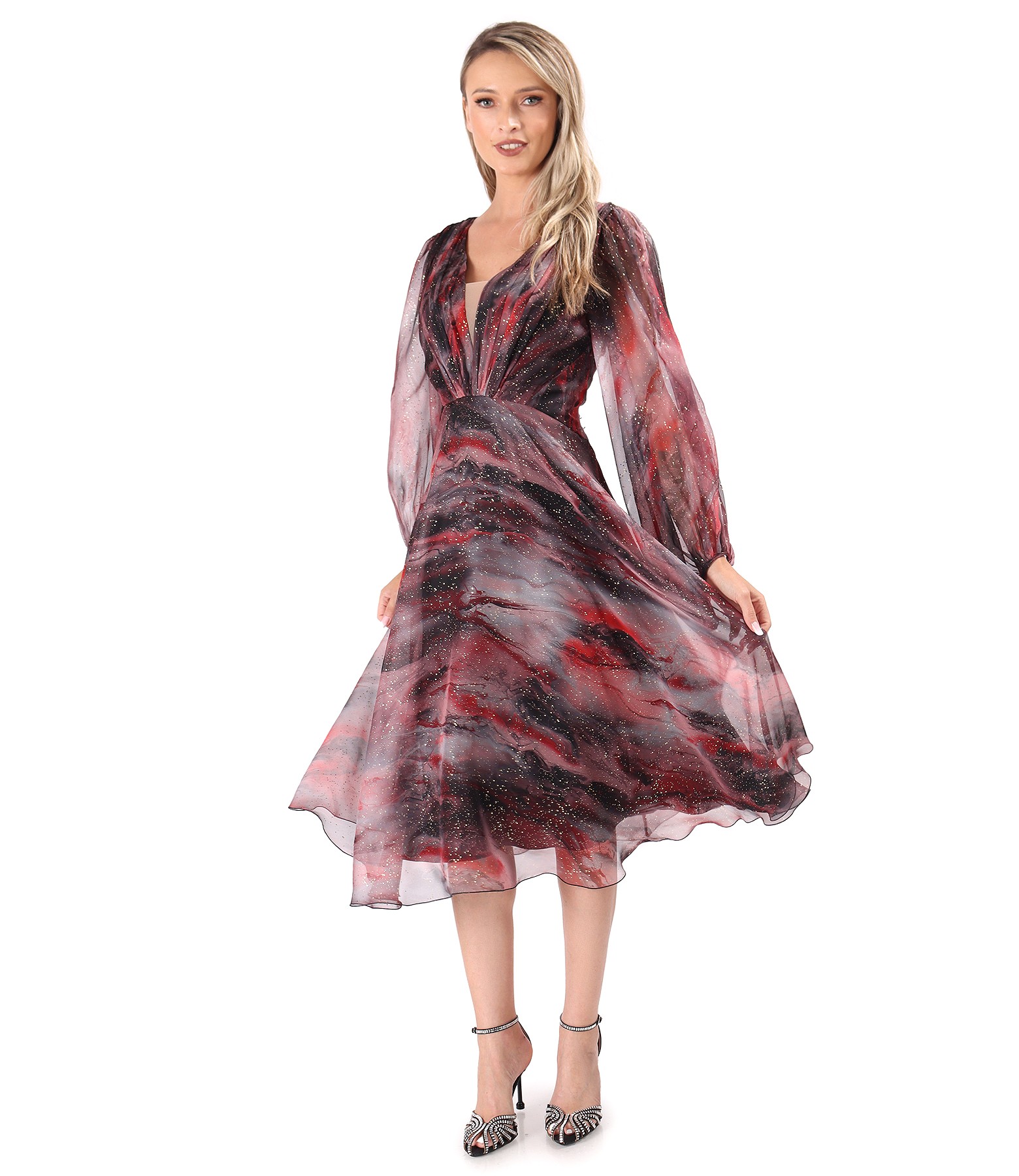 Rochie de seara din voal imprimat si cu motive aurii (Rosu Grena), marimea