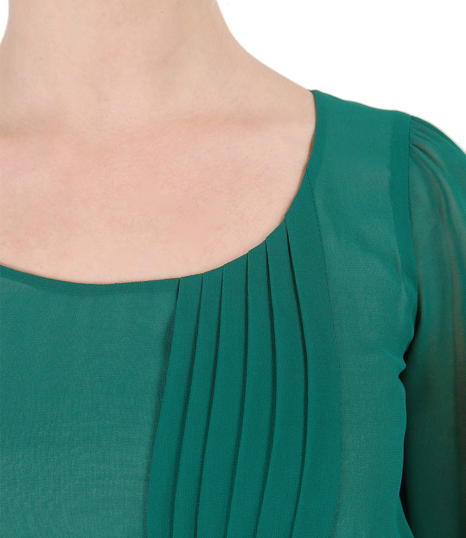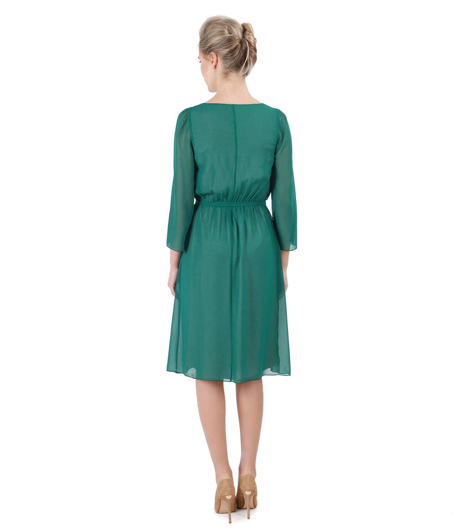 Rochie de seara, dublata cu viscoza, cu maneci 3/4, cu falduri pe fata si cordon in talie cu aplicatie de cristale. Nu are sistem de inchidere.