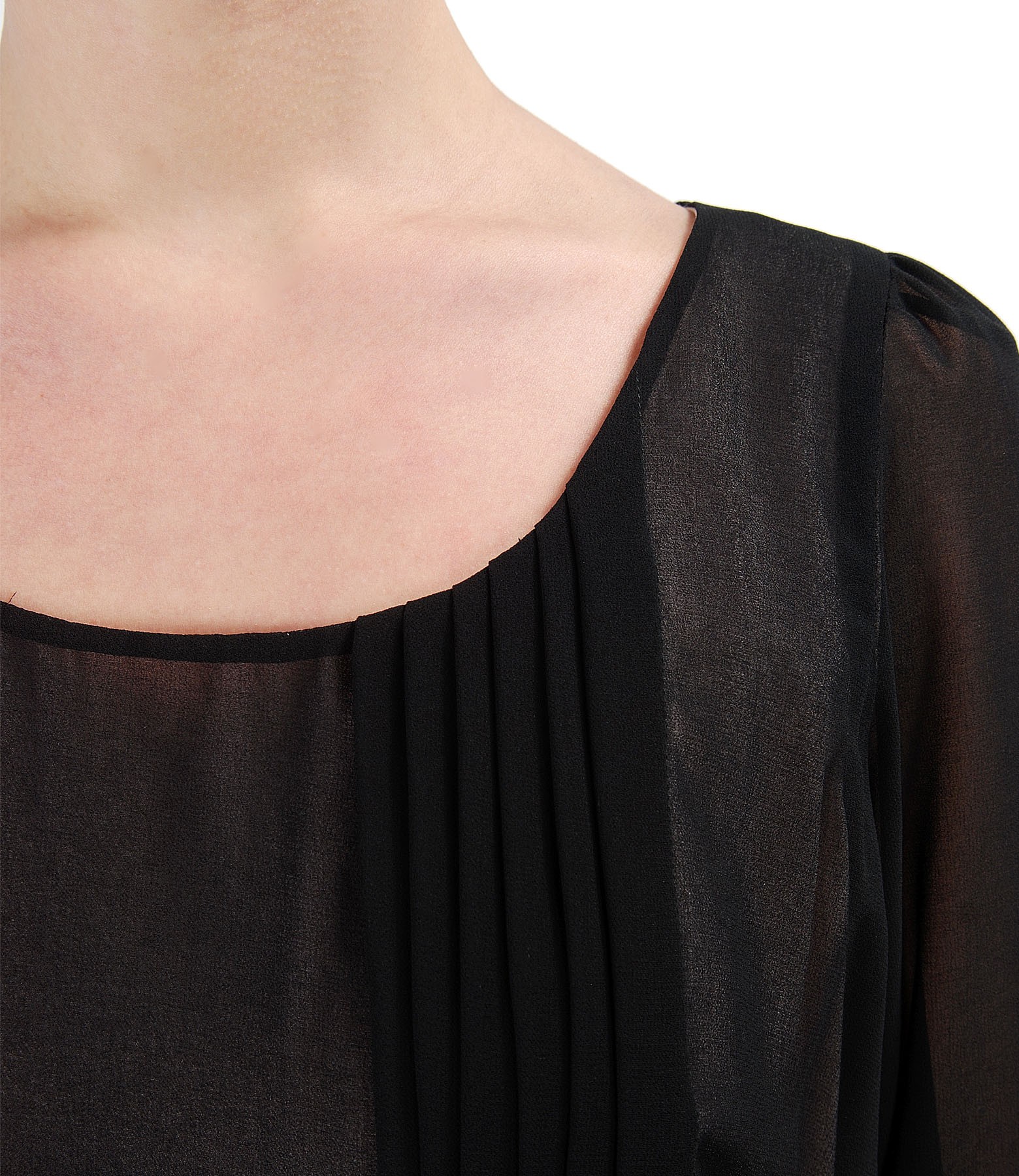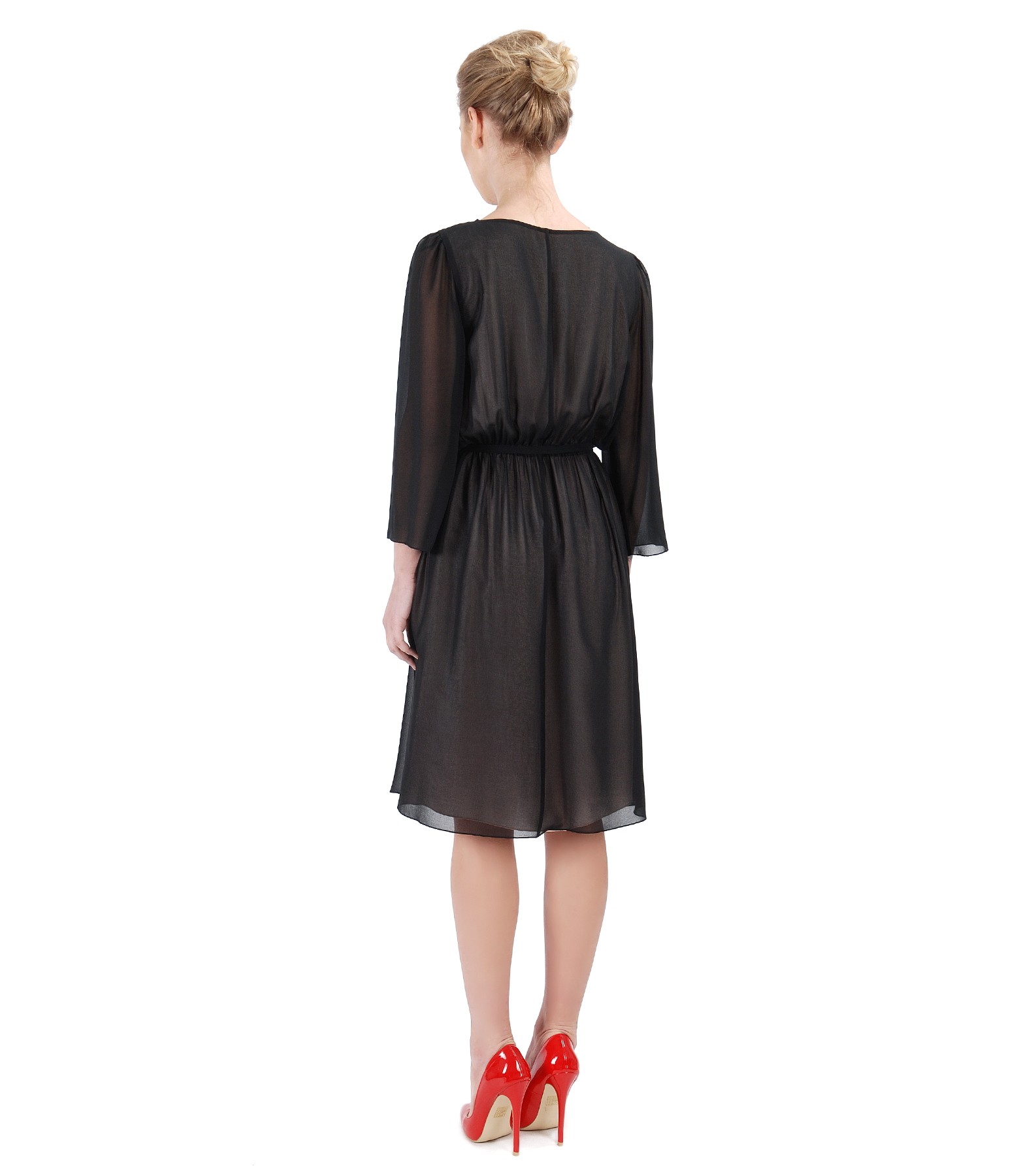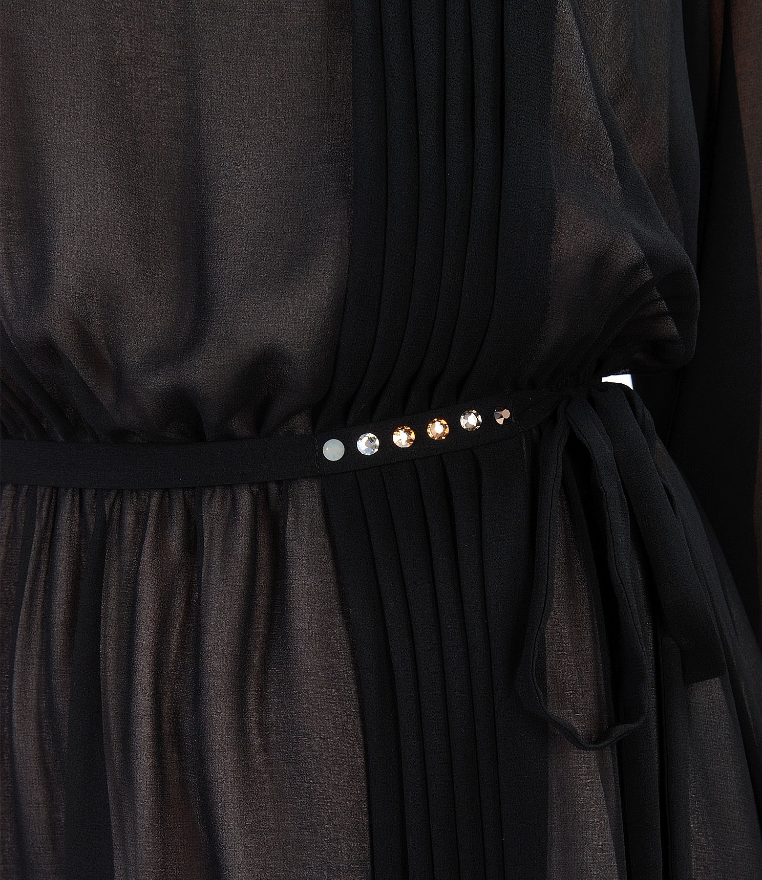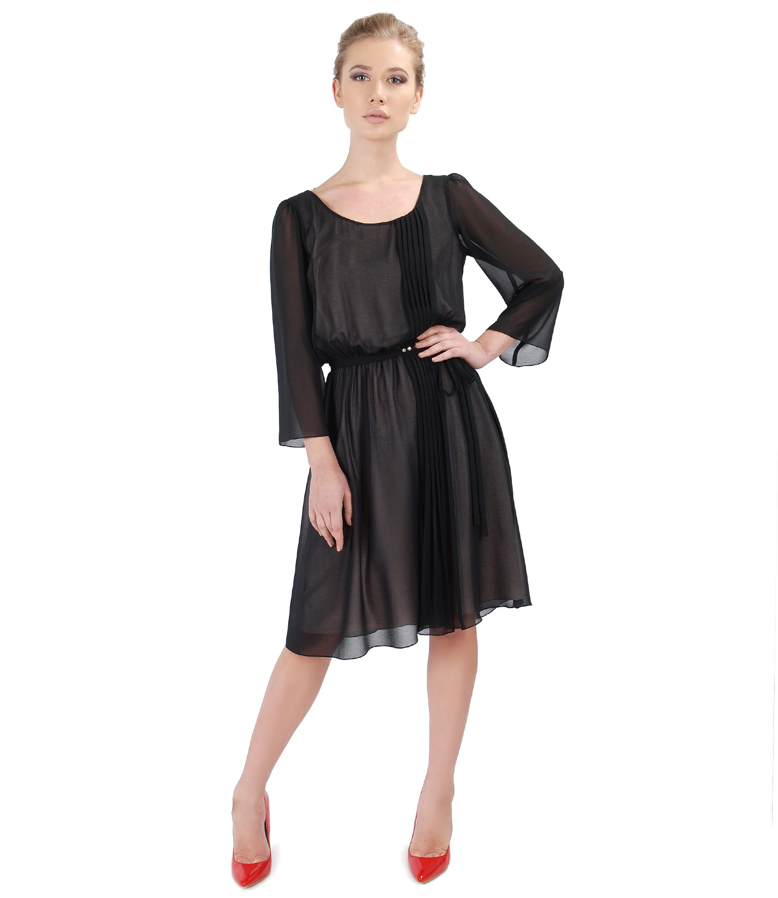 Rochie de seara, dublata cu viscoza, cu maneci 3/4, cu falduri pe fata si cordon in talie cu aplicatie de cristale. Nu are sistem de inchidere.