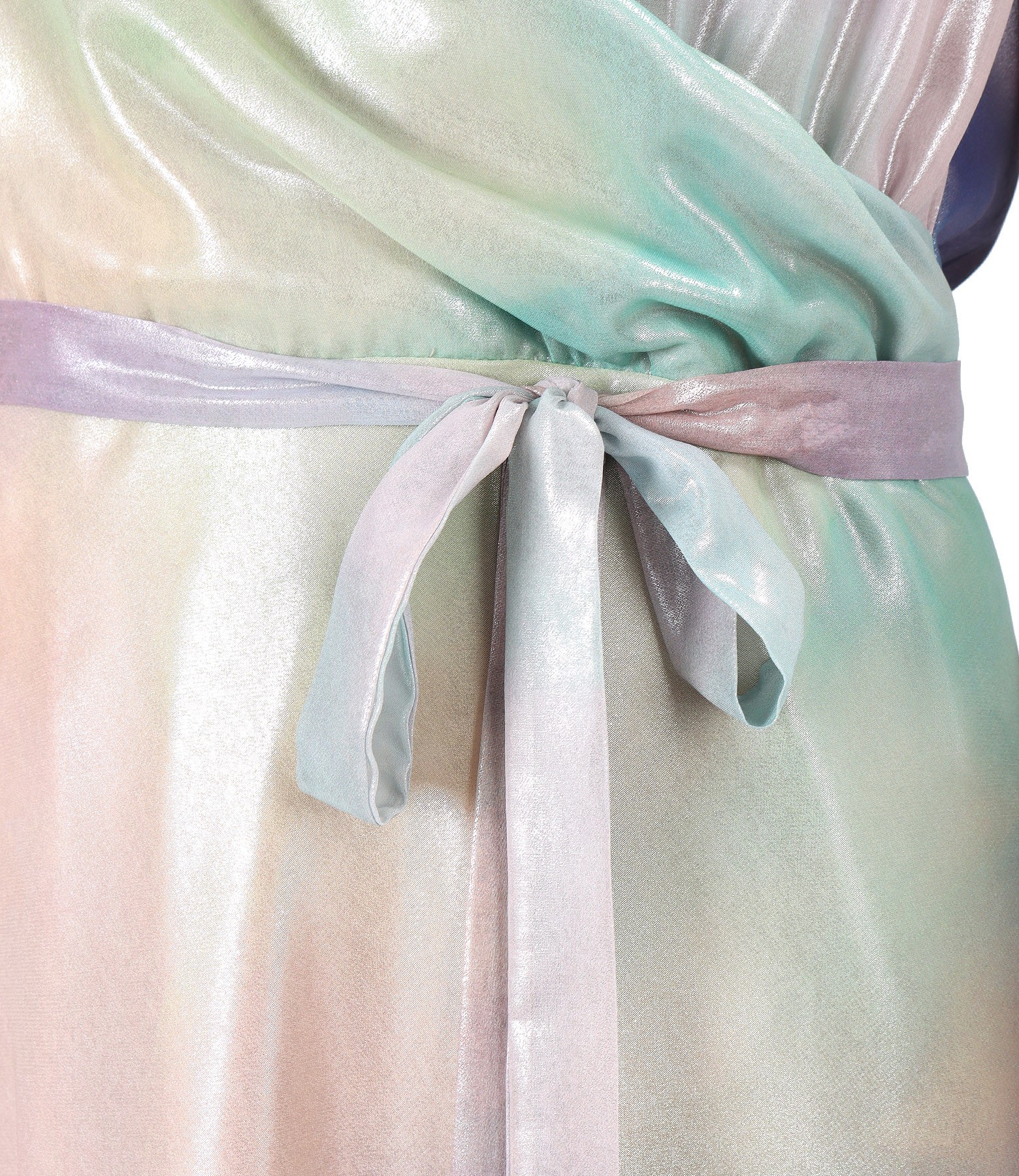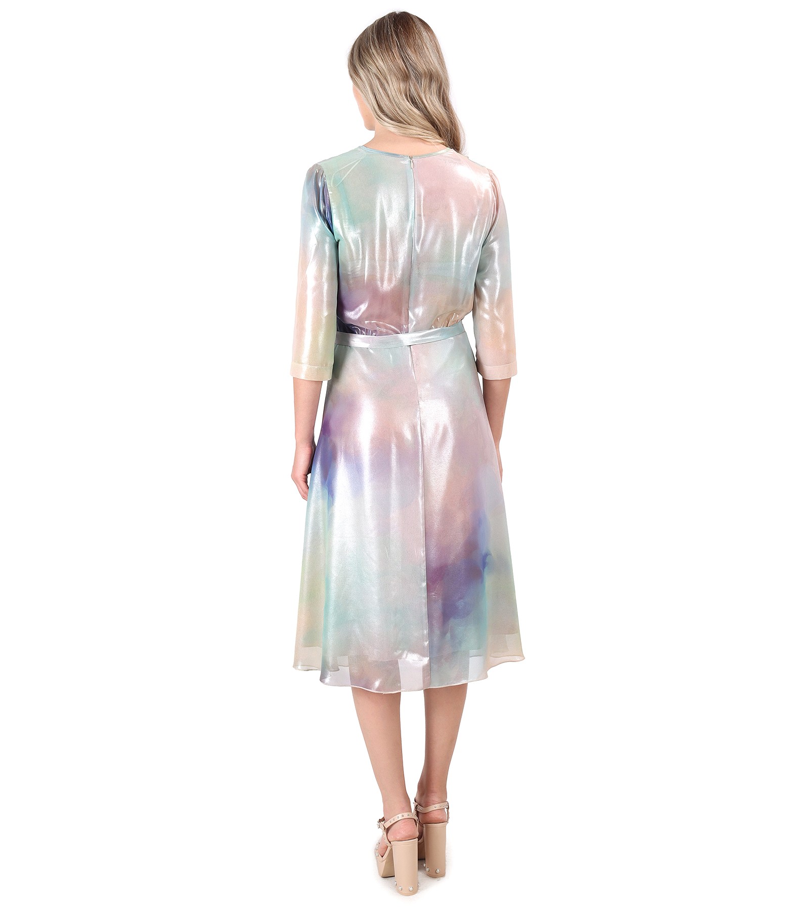 Rochie de seara din voal sidefat, captusita cu viscoza, cu maneci 3/4, pieptii petrecuti, cordon in talie. Se inchide cu fermoar ascuns pe mijloc spate.