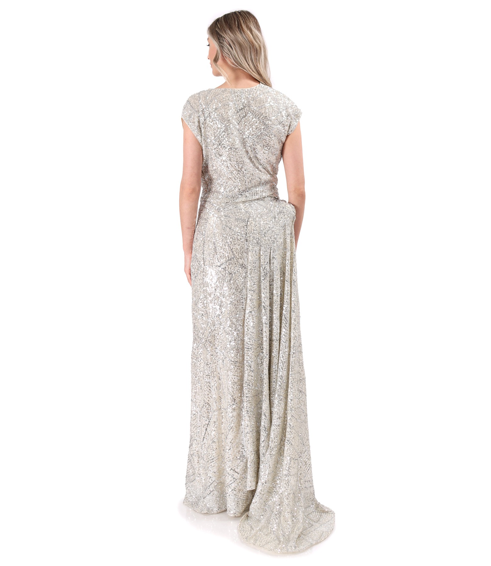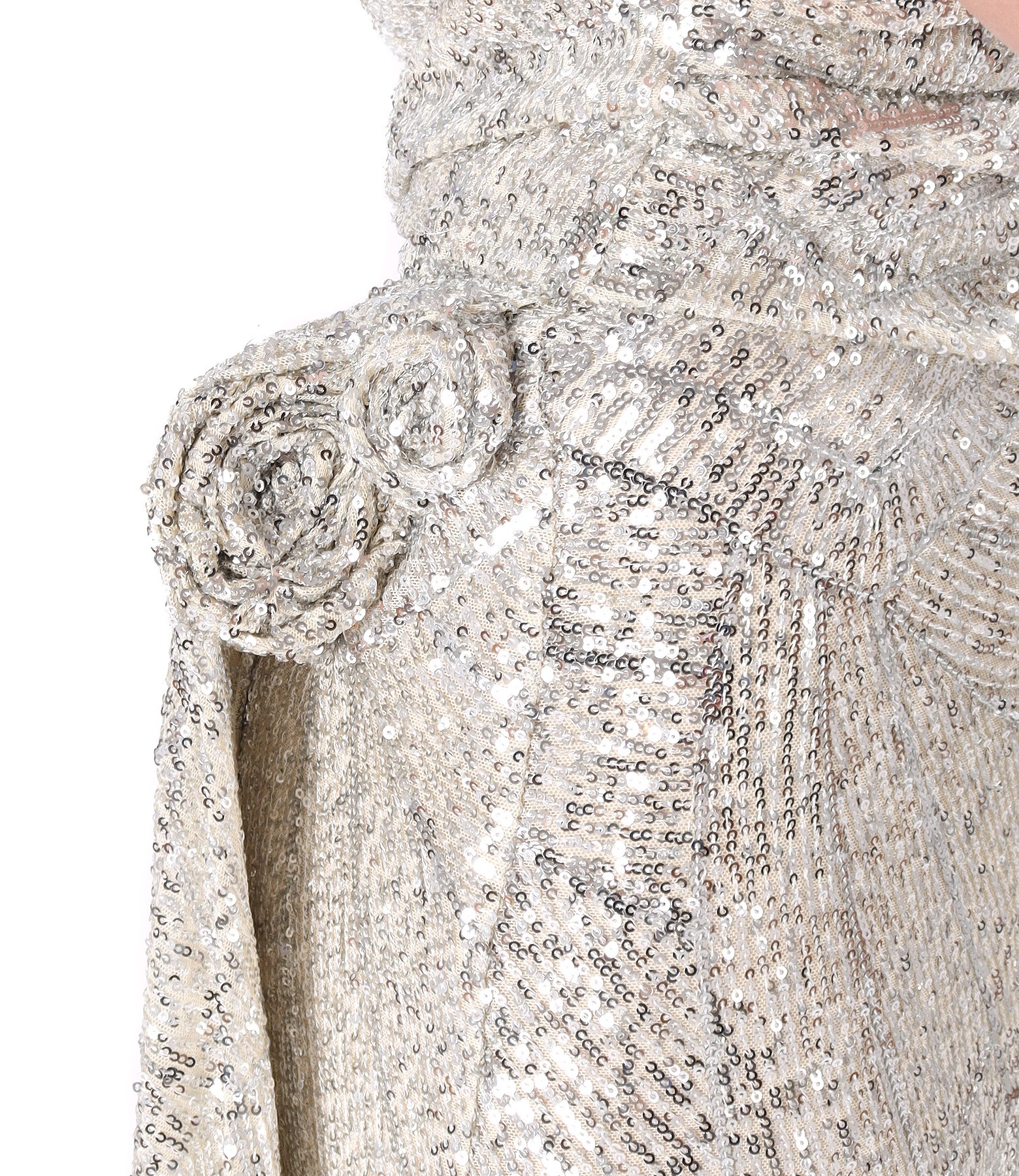 Rochie de seara lunga de paiete nude stralucitor metalizat cu elemente de couture. Are decolteu rafinat format de cute asimetrice ample, stranse pe talie, efect sofisticat dat de trena bogata sustinuta pe sold de trandafiri realizati manual din aceeasi tesatura. Interiorul este din tesatura satinata elastica fina. Se inchide cu fermoar ascuns in lateral stanga.